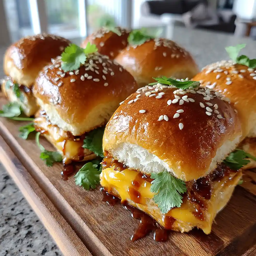 - Garnish and Serve: Transfer the sliders to a serving board or plate. Drizzle any remaining glaze across the plate for an extra touch of flavor and visual appeal. Sprinkle with chopped fresh cilantro and toasted sesame seeds for a fresh pop of color and added texture. Serve warm and enjoy!