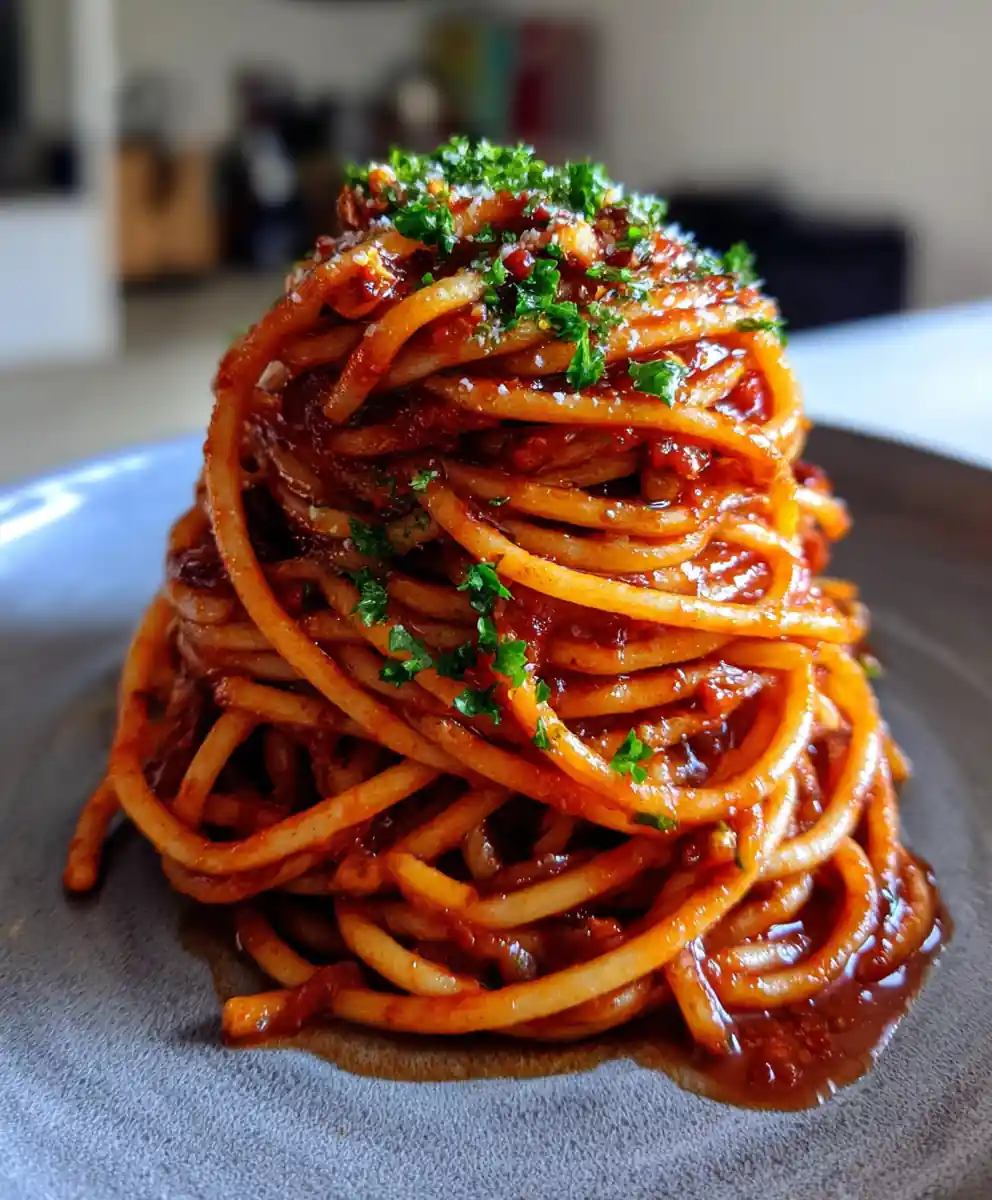 - Serve and Garnish: Plate generous portions of the sauced spaghetti. Drizzle with extra virgin olive oil and garnish generously with fresh chopped parsley. Serve immediately.