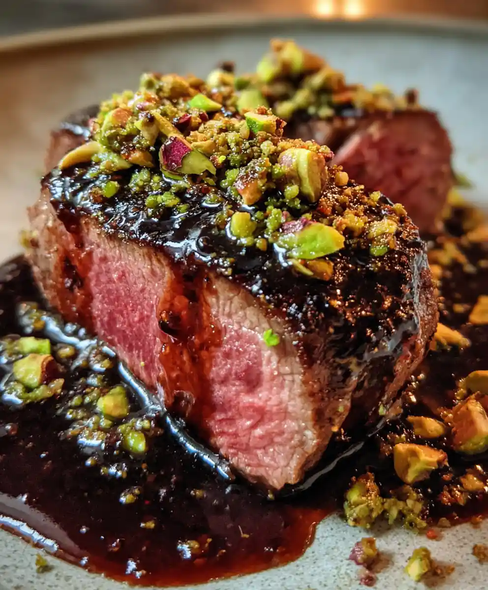 - Slice and Plate: Slice the rested deer steaks into medallions. Arrange them on a plate. Spoon the prepared glaze generously over the steak, allowing some to pool on the plate. Sprinkle the pistachio-herb crumble over the glazed steak for added color and texture.
