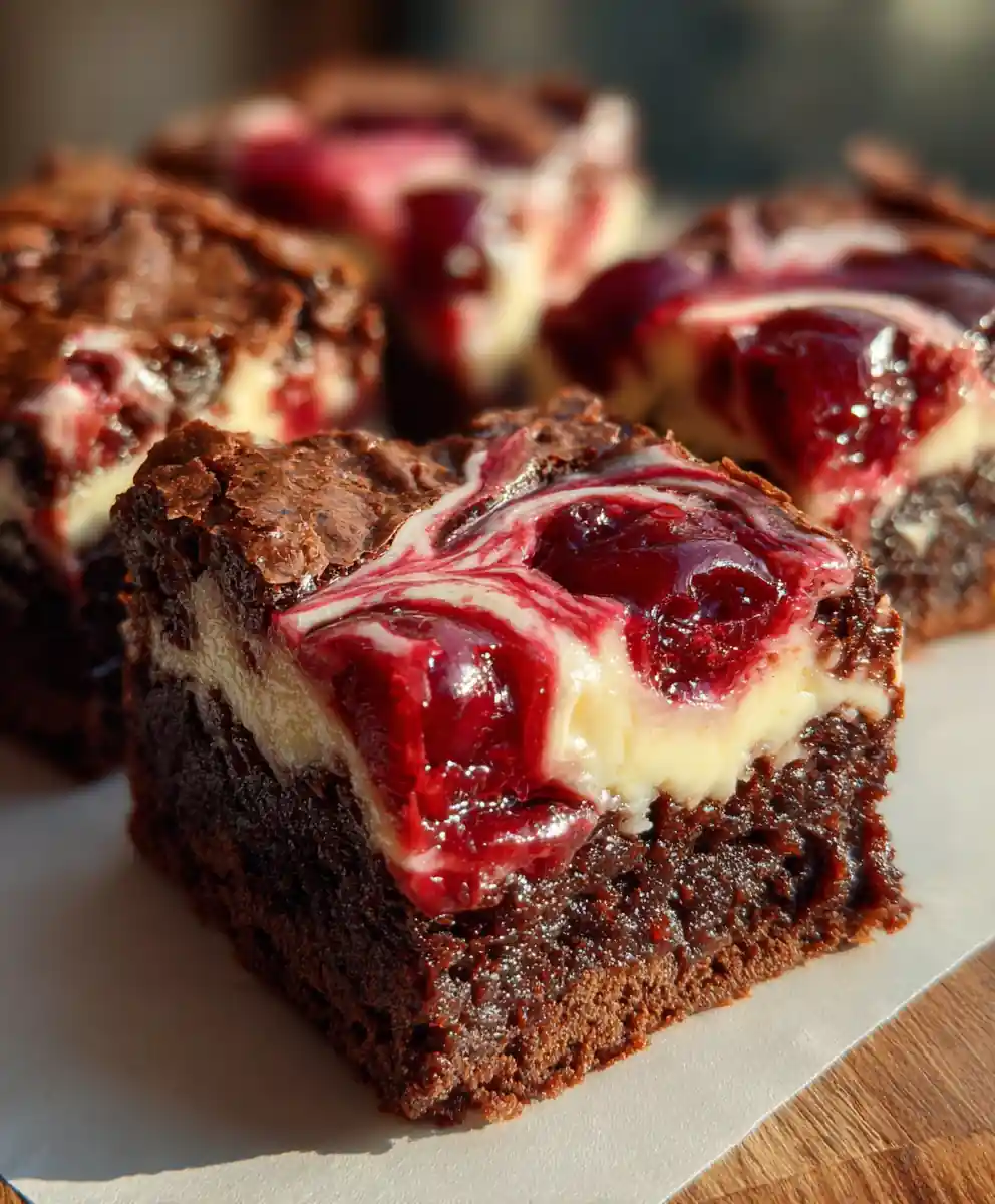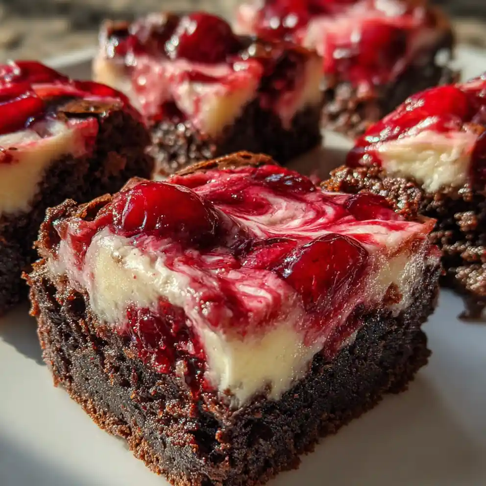 This recipe creates fudgy brownies topped with a vibrant cherry ripple frosting, combining rich chocolate with a tangy, fruity cream cheese topping for a delicious dessert.