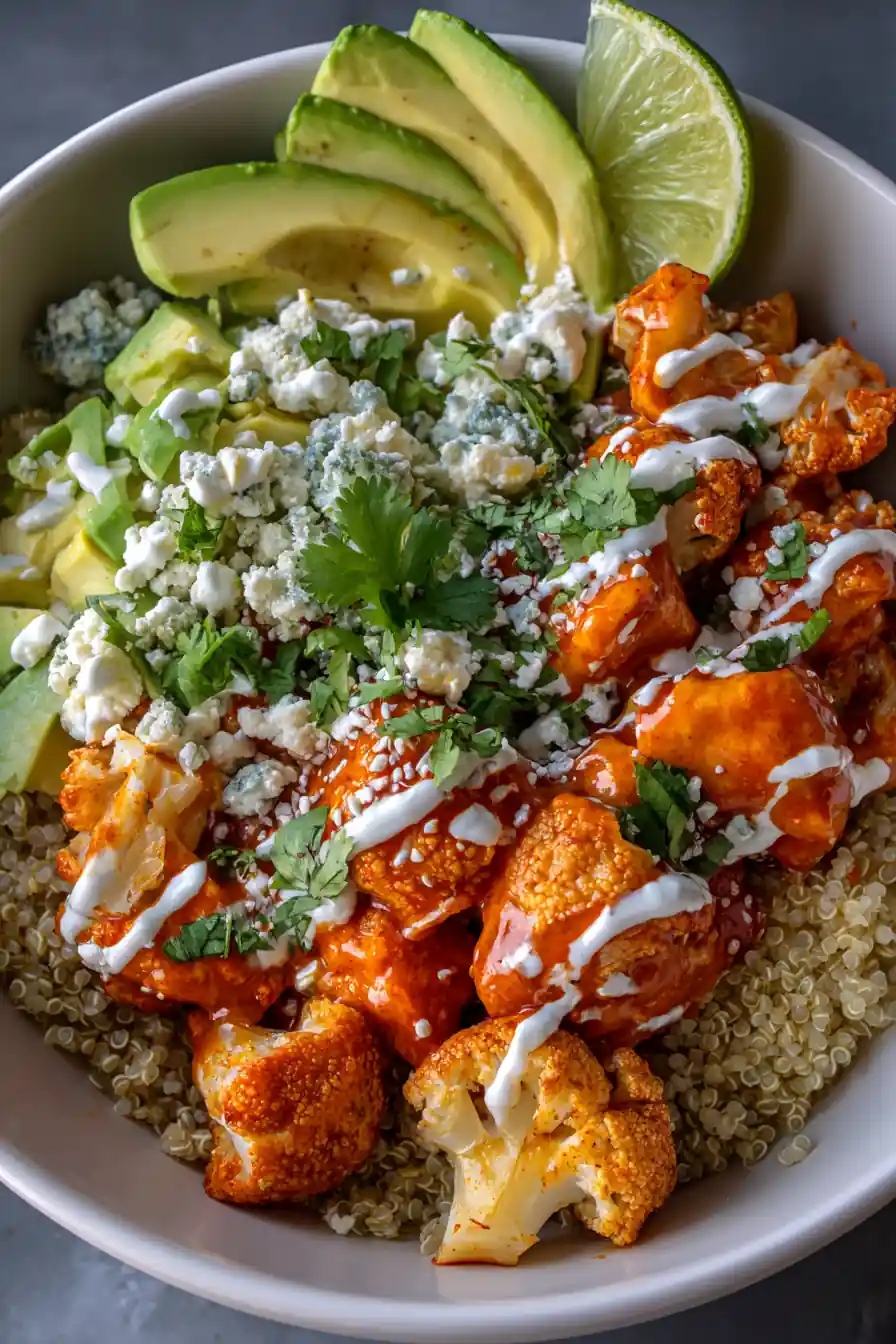 7. Assemble the Bowls: To assemble each bowl, start with a base of ยฝ cup (approximately 100g) of cooked quinoa. Layer the buffalo chicken, roasted cauliflower, and avocado slices on top of the quinoa. Sprinkle generously with crumbled blue cheese.