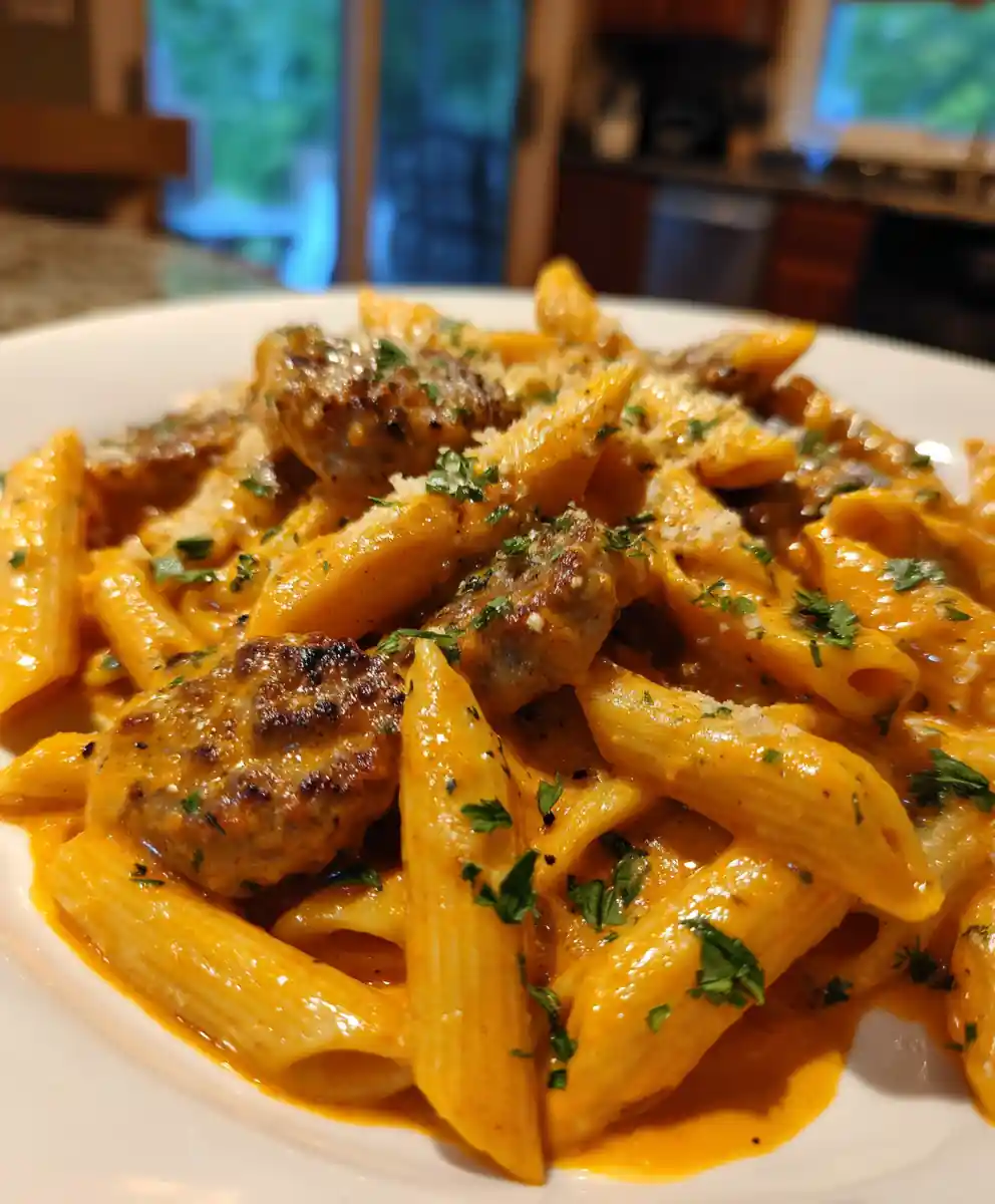 6. Finish and Serve: Add the cooked penne pasta to the skillet with the sauce and sausage. Toss gently to coat every piece of pasta. Cook for another 1-2 minutes until heated through. Serve hot, garnished with fresh chopped parsley.