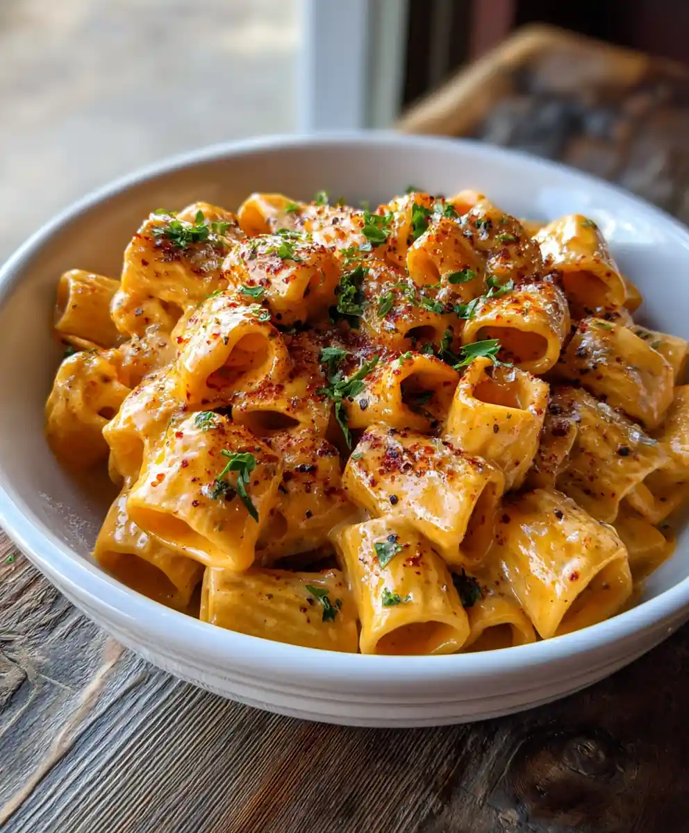 - Plate and Garnish: Plate the Cajun Spiced Cream Ribbon Rigatoni Alfredo in shallow white bowls. This allows the vibrant colors of the dish to really pop. Arrange the pasta to showcase the beautiful cross-section of the ribbons. Finish with a generous sprinkle of chopped fresh parsley for freshness and a light dusting of smoked paprika for a final touch of color and smoky flavor.