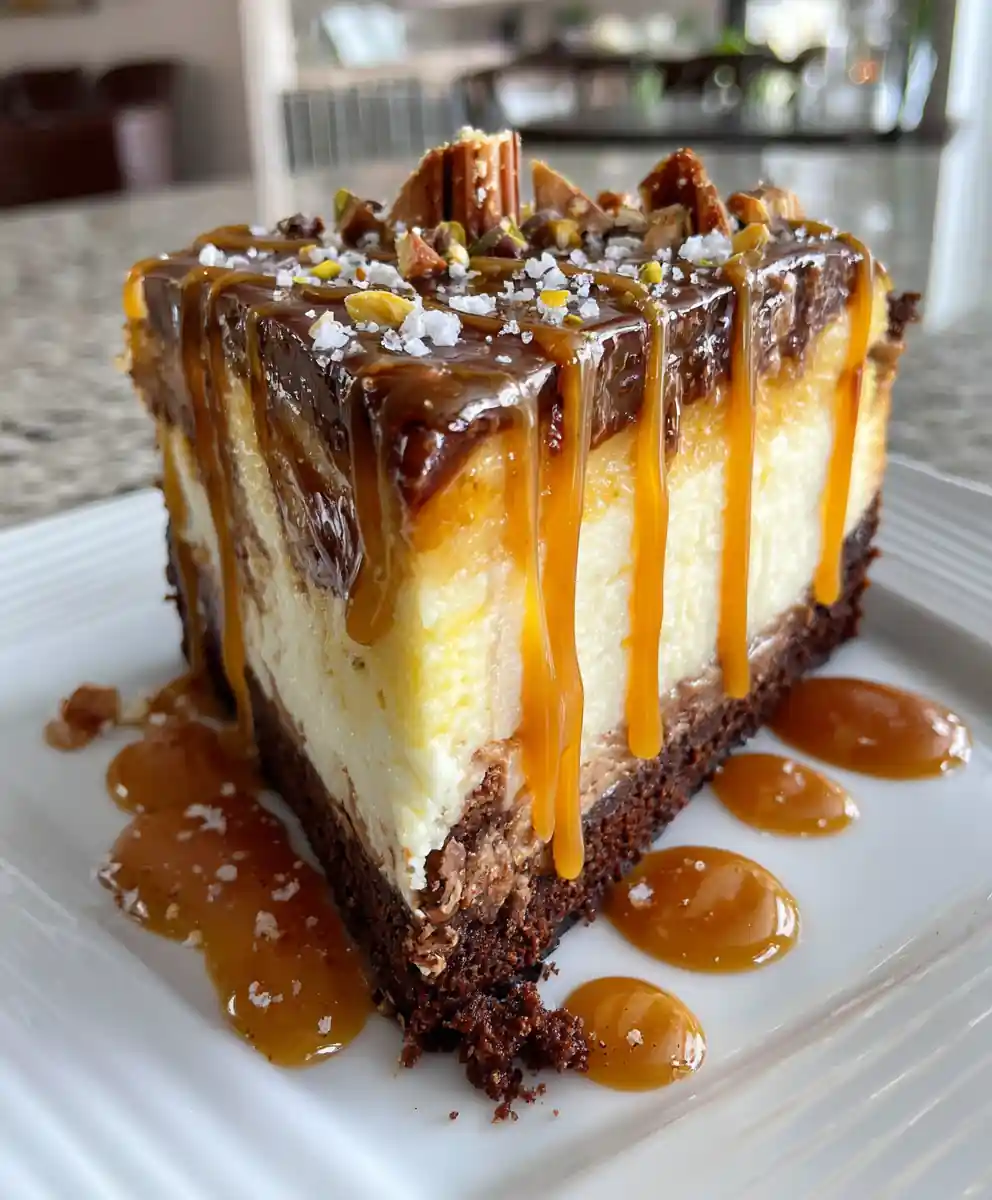 Indulge in a decadent Cardamom Caramel Swirl Brownie Cheesecake, featuring a fudgy brownie base, creamy cheesecake filling, and a luscious cardamom caramel swirl. This dessert is perfect for special occasions or a serious chocolate craving.