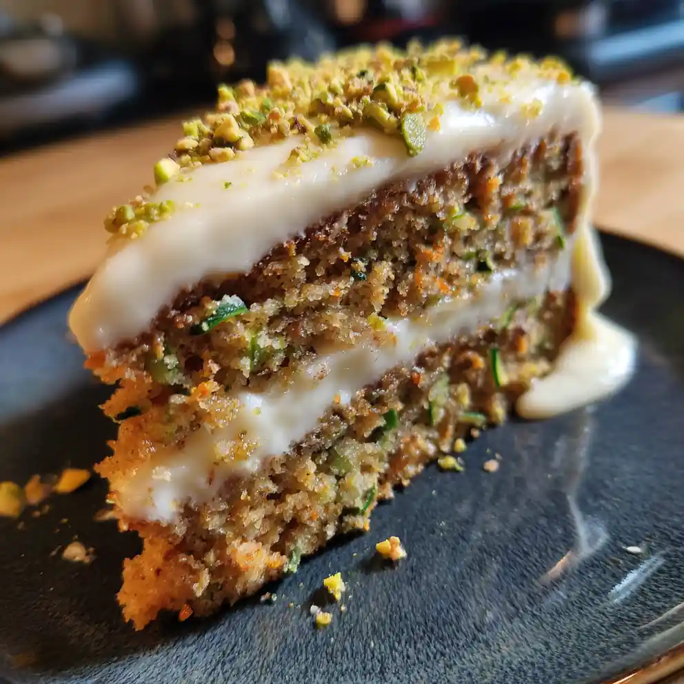 This Carrot Zucchini Cake is a moist and tender delight, spiced with cinnamon and ginger, and topped with a cardamom cream cheese frosting and crunchy pistachio crumble. It’s a flavorful and textural experience perfect for any occasion.