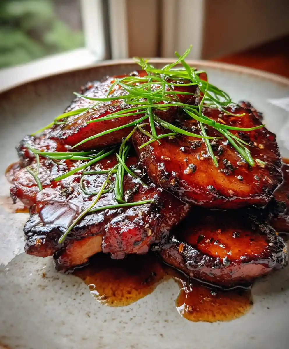 7. Rest, Slice, and Serve: Remove the chicken from the oven and let it rest on a cutting board for 5-10 minutes. Slice the rested chicken thighs against the grain into 1/2 inch thick pieces. Arrange the slices on a plate and drizzle generously with the reserved serving glaze. Garnish with a sprinkle of sliced chives and extra freshly cracked black pepper.