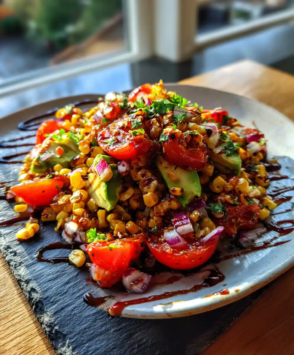 This vibrant salad combines charred corn, juicy tomatoes, creamy avocado, and a tangy pomegranate molasses drizzle for a burst of summer flavor. It’s an easy and colorful addition to any meal, perfect as a side or light lunch.