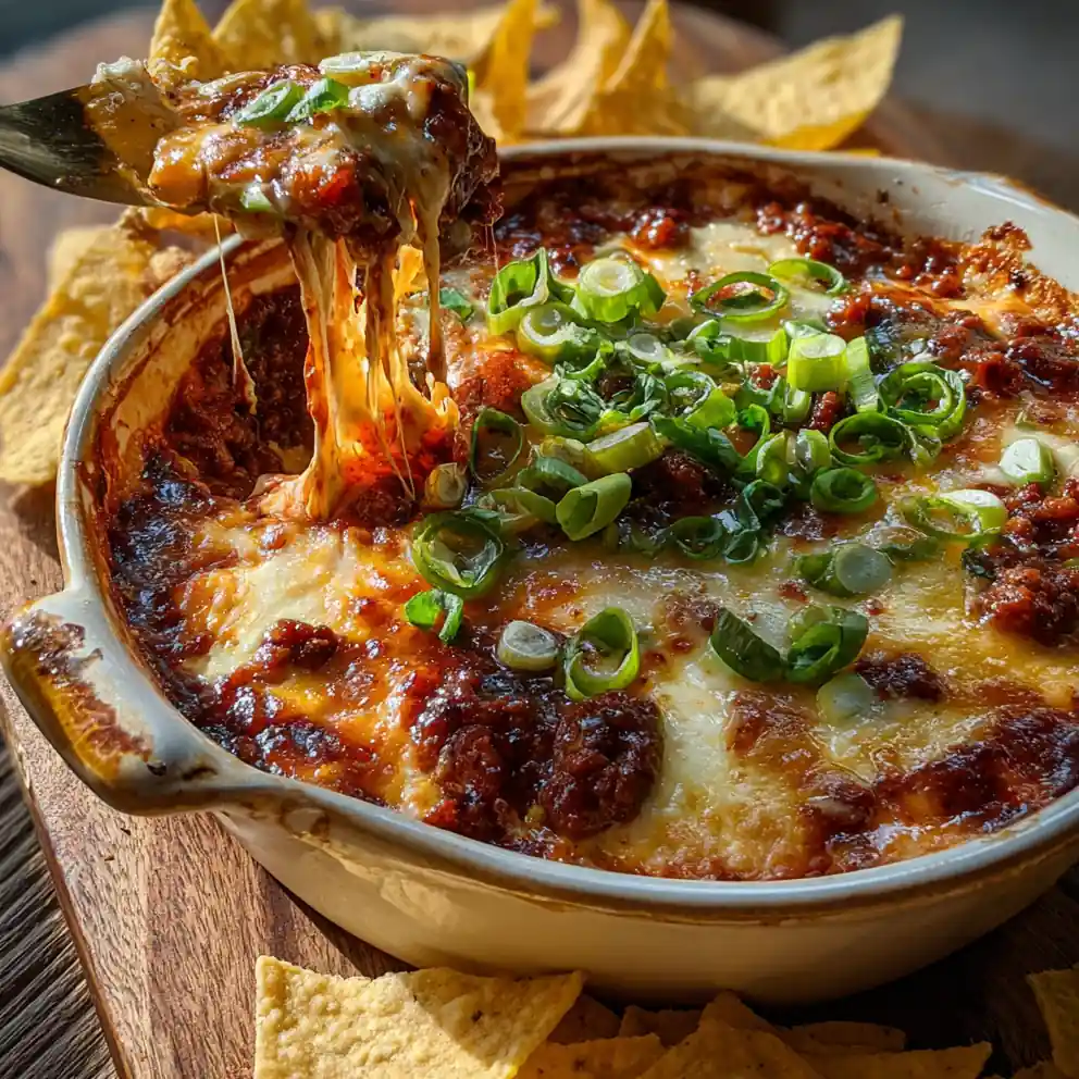 6. Bake and Serve: Bake in a preheated oven at 350ยฐF (180ยฐC) for 20-25 minutes, or until bubbly around the edges. Garnish with freshly sliced green onions before serving immediately with tortilla chips or bread.