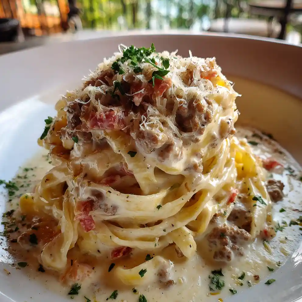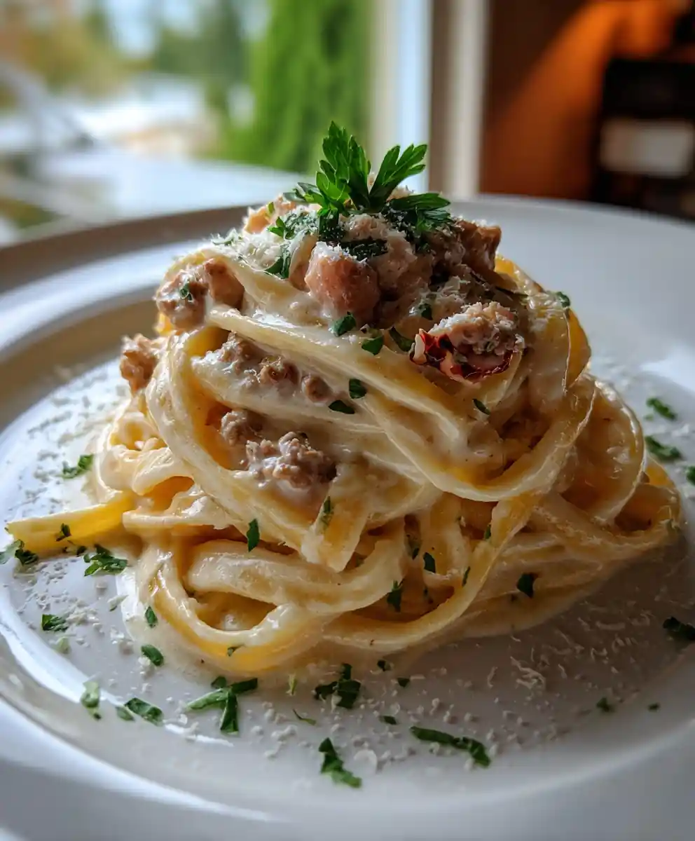 - Plate and Garnish: Plate the Cheeseburger Alfredo Pasta on a wide, white dinner plate. Use a fork and spoon to twirl a generous mound of pasta in the center of the plate. Drizzle an extra spoonful of the tomato-turkey swirl around the edge of the pasta for a visually striking ribbon effect. Finish with a generous sprinkle of chopped fresh parsley and a dusting of extra grated Parmesan cheese. Serve immediately while the sauce is warm and glossy.