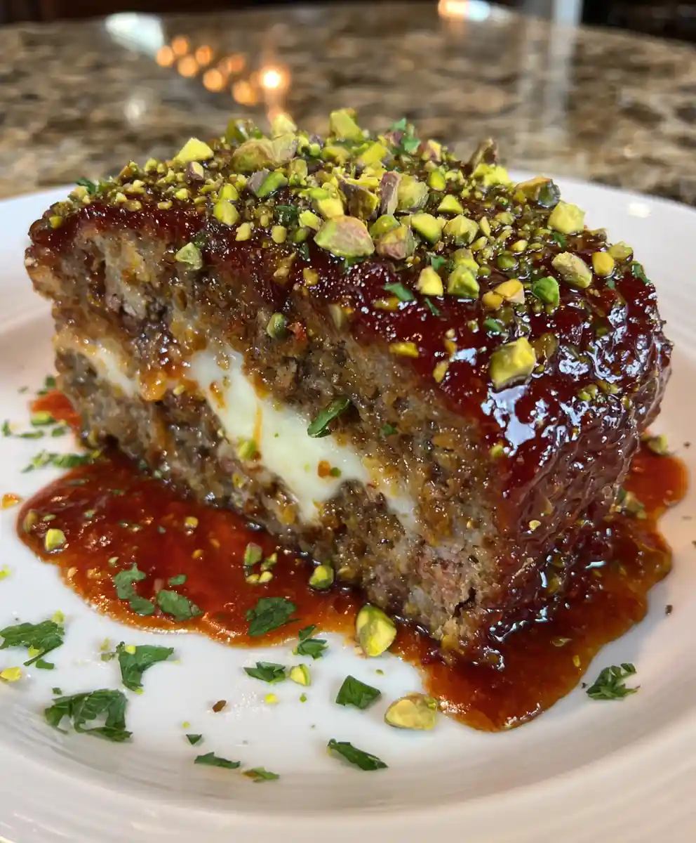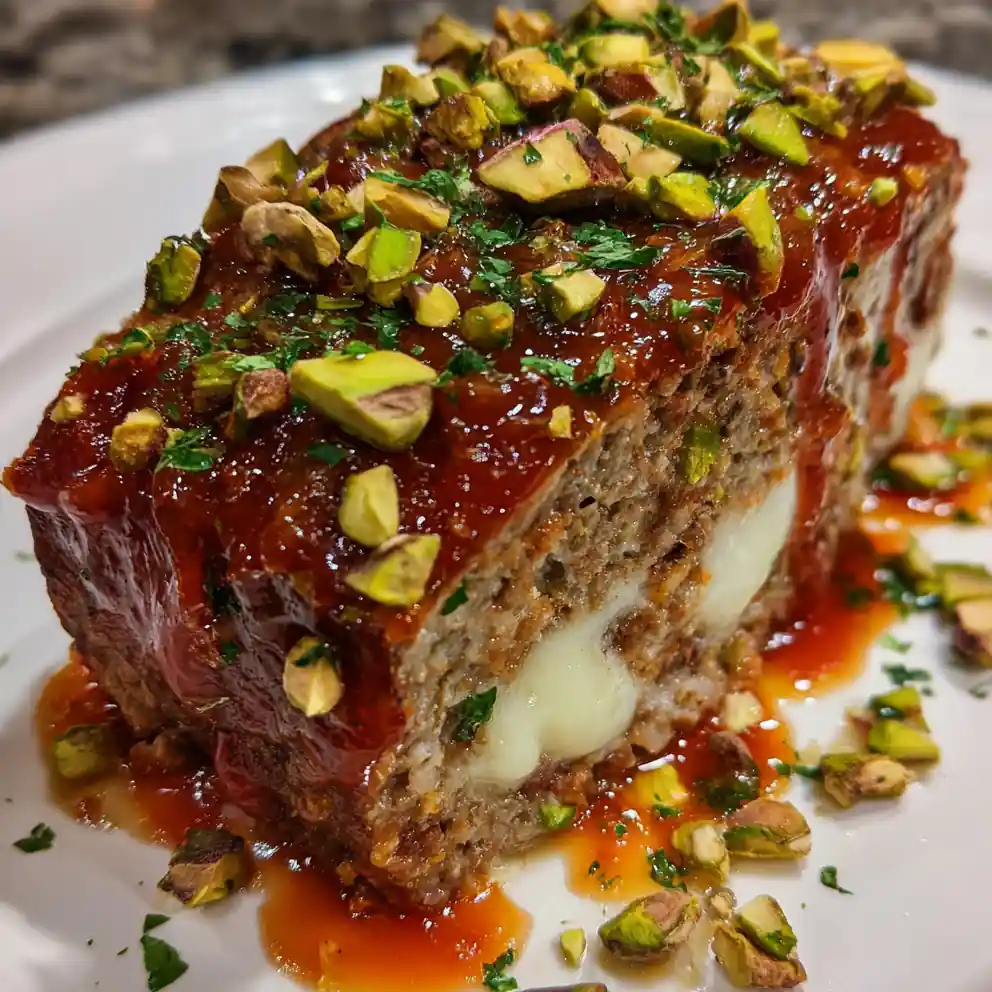 8. Prepare Garnish and Serve: While meatloaf rests, toast 0.25 cup shelled pistachios in a dry skillet for 3-5 minutes until fragrant, then chop. Serve sliced meatloaf with the remaining glaze, toasted pistachios, and 2 tbsp fresh parsley.