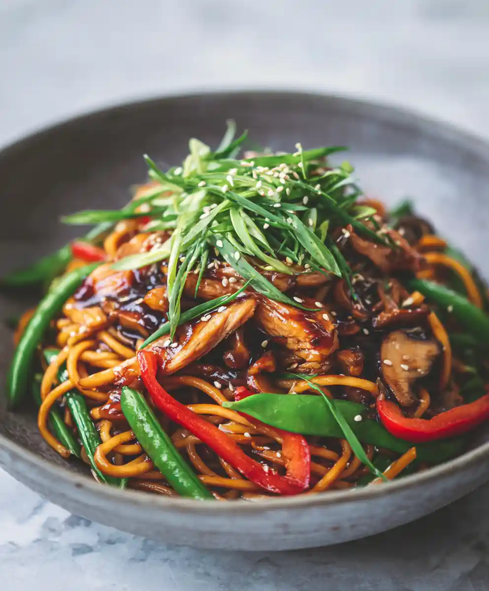 - Final Toss and Serve: Add the cooked lo mein noodles to the skillet with the chicken and vegetables. Toss everything together vigorously to ensure all components are thoroughly coated in the glaze. Stir in the toasted sesame oil just before serving, then garnish generously with spring onions and sesame seeds.