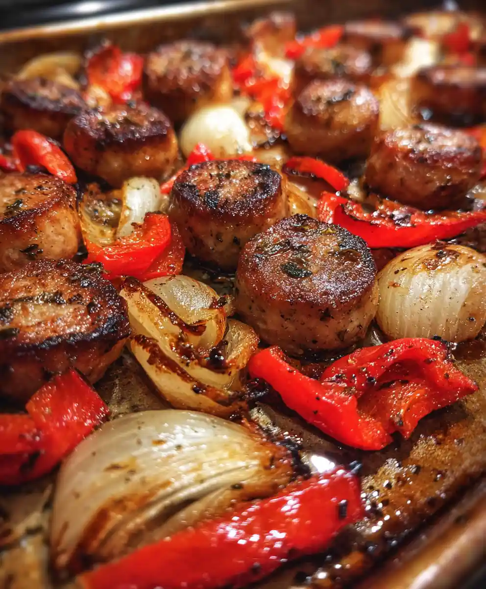 - 1. Prep Your Ingredients: Preheat oven to 400ยฐF (200ยฐC). Slice the chicken sausage into ยฝ-inch coins. Deseed and slice the red bell peppers and onion into similar-sized pieces for even cooking.