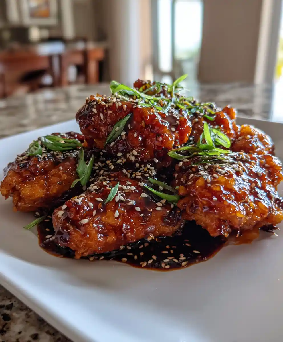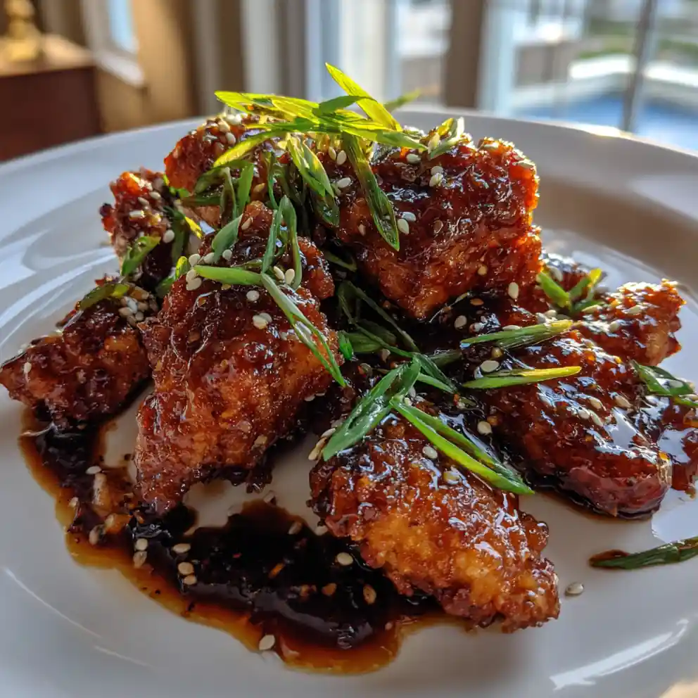 - Combine and Serve: Add the double-fried chicken to the saucepan with the glaze. Toss gently with tongs until fully coated. Serve immediately, garnished with sliced green onions and toasted sesame seeds.