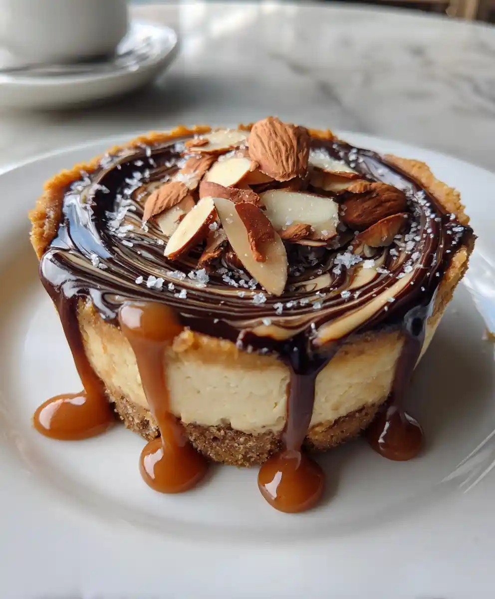 - Serve and Garnish: Gently unmold each cheesecake cup onto a serving plate. Drizzle a thin ribbon of salted caramel over the top of each cup and sprinkle with toasted almond slices and a light pinch of flaky sea salt.