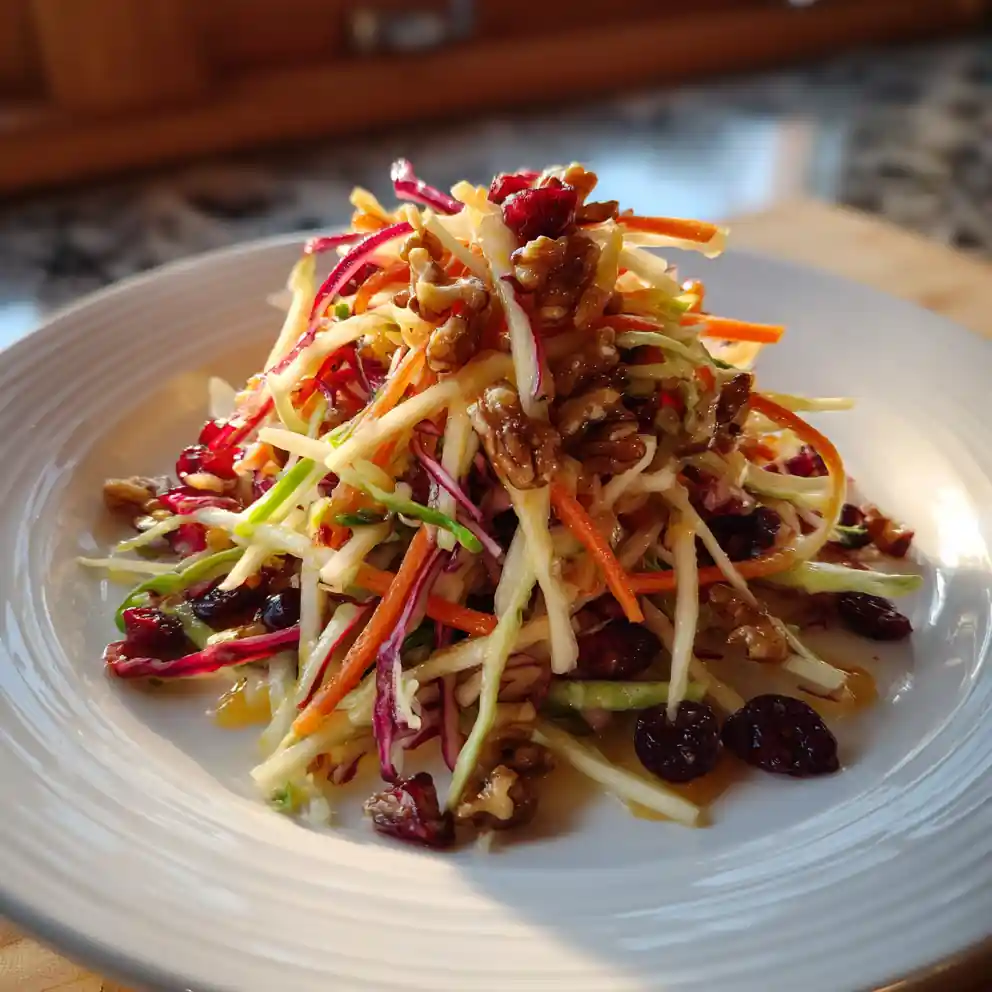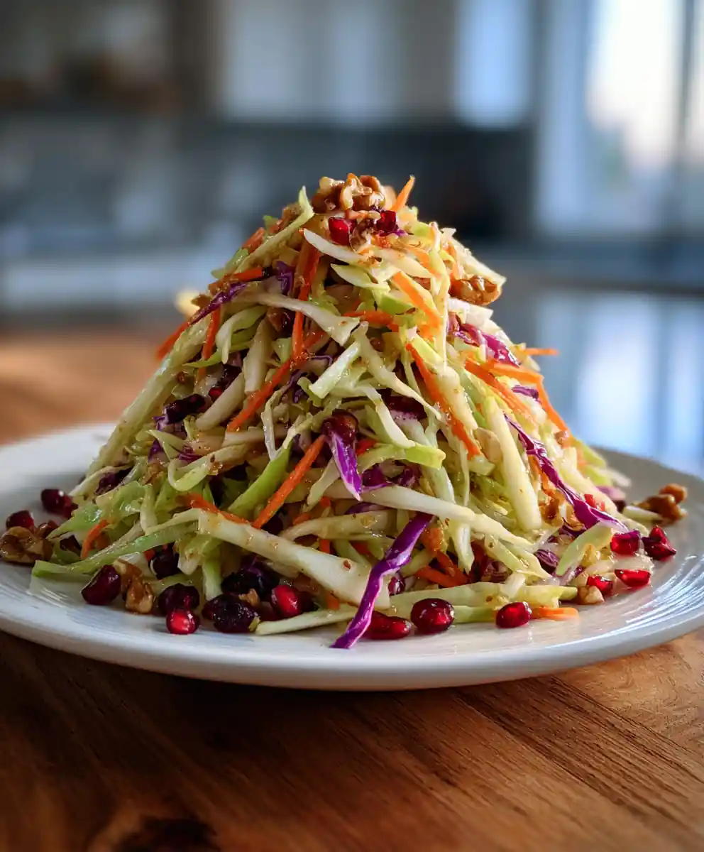 - Plate & Garnish: Serve coleslaw topped with toasted walnuts and pomegranate seeds.