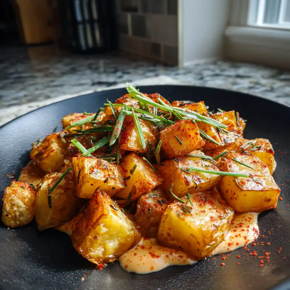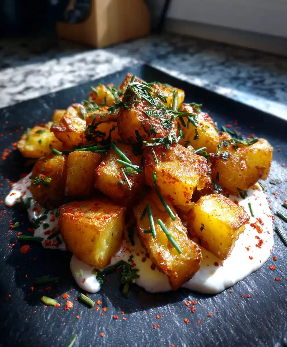 - Assemble & Garnish: Drizzle potatoes with sauce and garnish with paprika and chives.