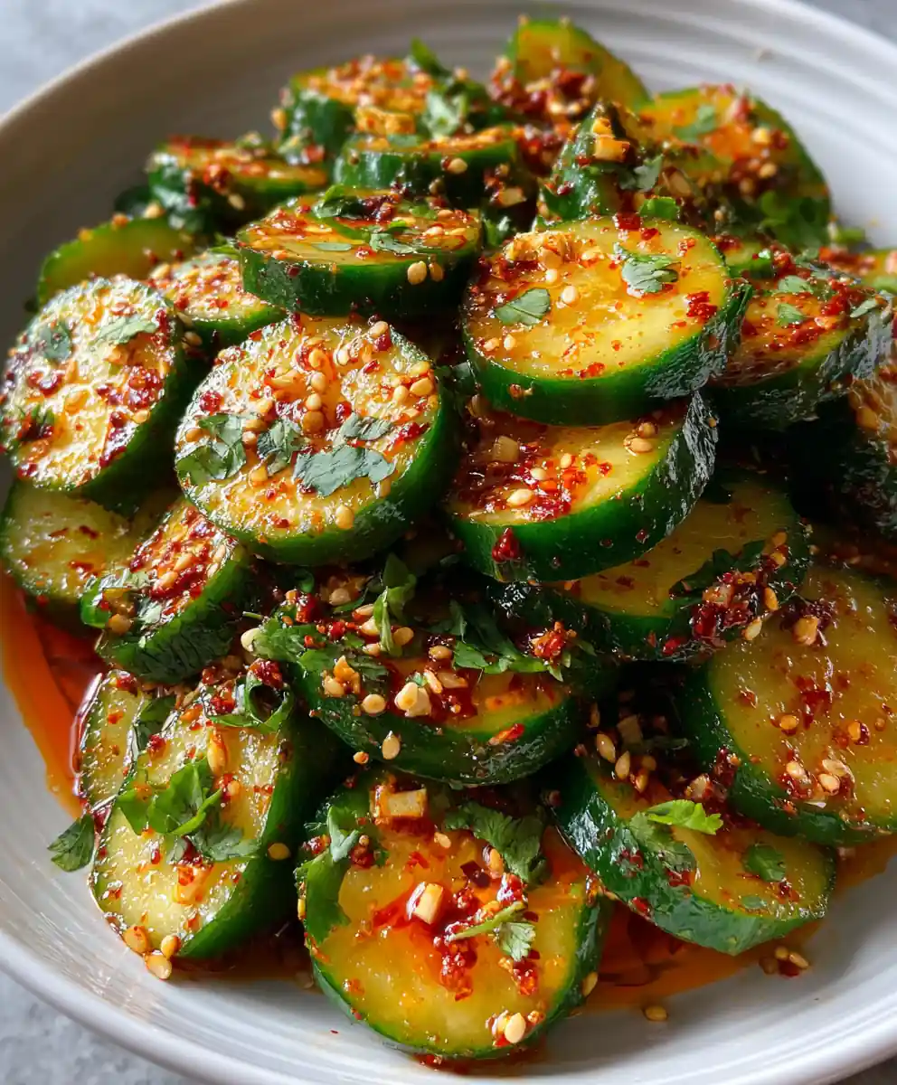 This cucumber salad with chili oil and sesame spark offers an irresistible crunch and a vibrant, savory-spicy aroma, making it a great side dish for any meal.