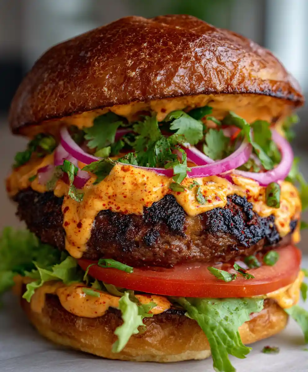 - Prepare Aioli and Assemble: In a small bowl, whisk together the mayonnaise, lemon juice, very finely minced garlic, 0.5 teaspoon smoked paprika, and Aleppo chili flakes until smooth. Spread a generous layer of aioli on both bun halves. On the bottom bun, layer lettuce and tomato, then the deer patty. Finish with red onion and cilantro for plating.