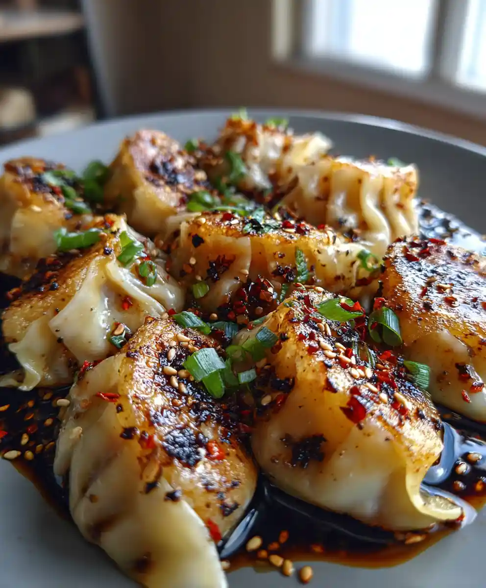 A pan-fried dumpling recipe featuring crispy bottoms, a juicy chicken filling, and a unique spicy black garlic glaze. This recipe creates perfect potstickers, ideal for a satisfying family dinner or meal prep.