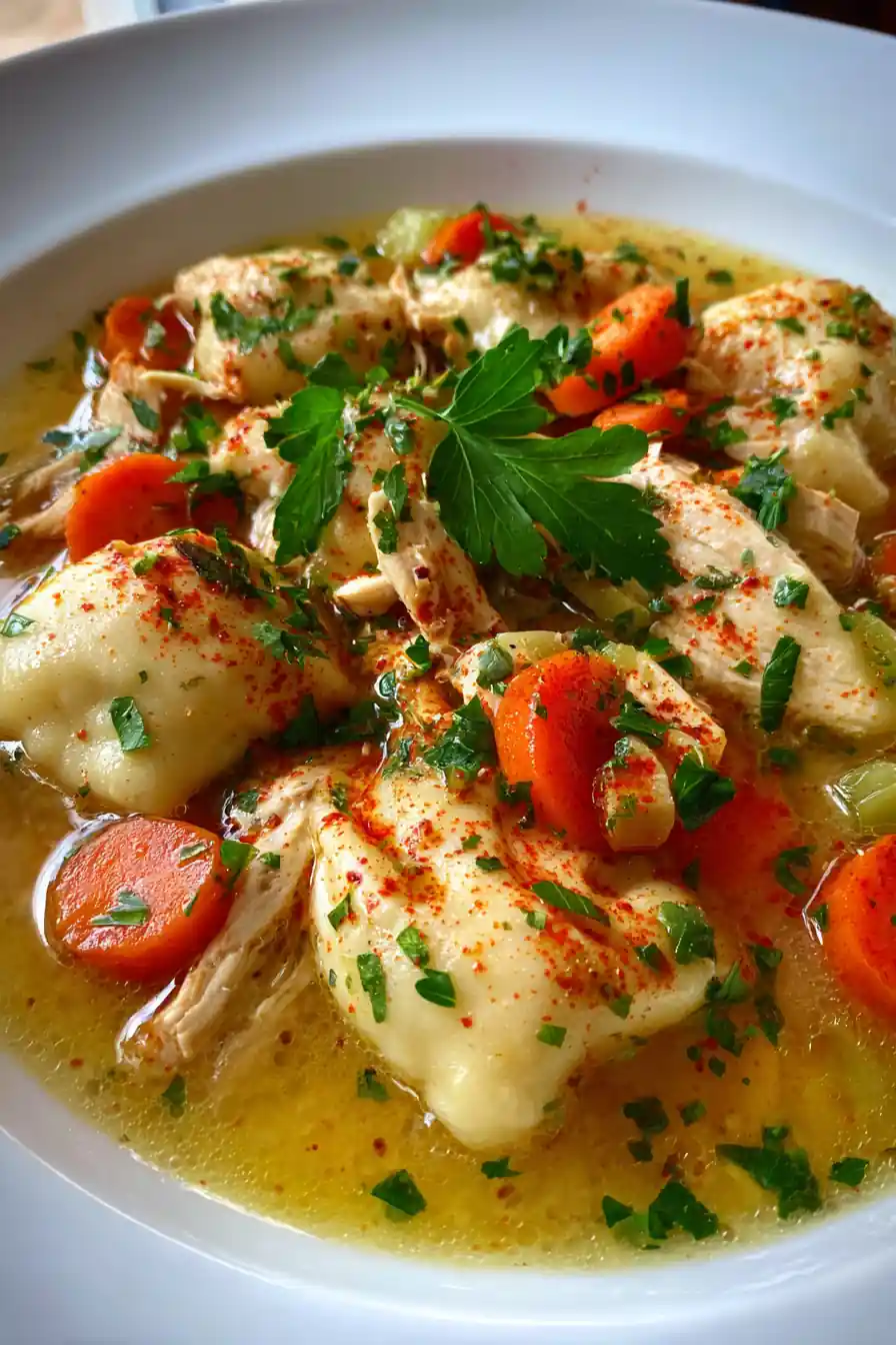 - Finish and Serve: Remove the bay leaf. Taste the soup and adjust the seasoning with additional salt or pepper if needed. Ladle the chicken and dumplings into shallow bowls. Garnish with a generous sprinkle of fresh parsley, a drizzle of chili oil (optional, for a touch of heat), and a light dusting of smoked paprika (optional, for color). Serve immediately while hot.