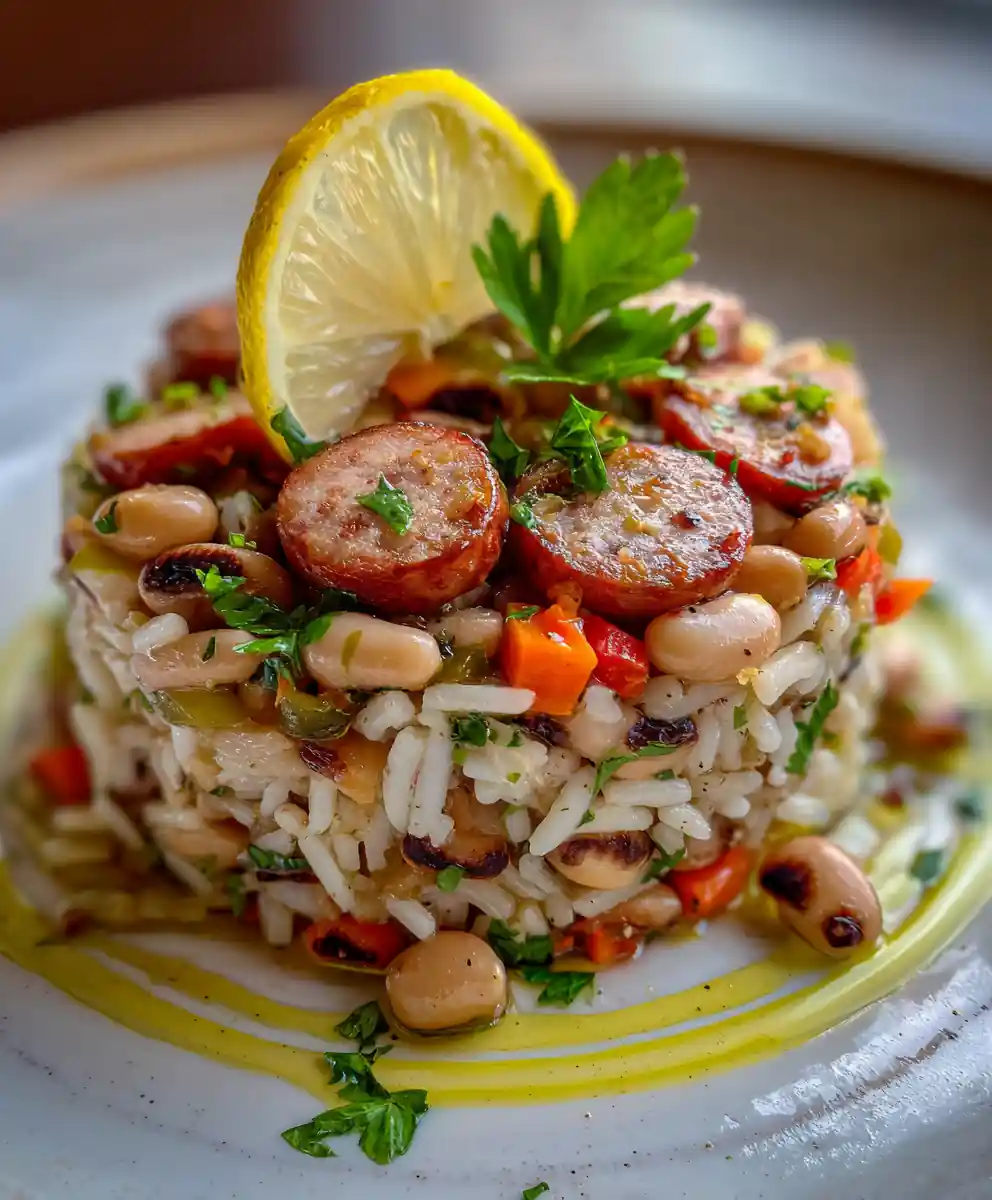 Hoppin’ John is a traditional Southern dish of black-eyed peas and rice, believed to bring good luck when eaten on New Year’s Day. This recipe simplifies the process while maintaining authentic flavor, featuring smoked turkey sausage and aromatic vegetables.