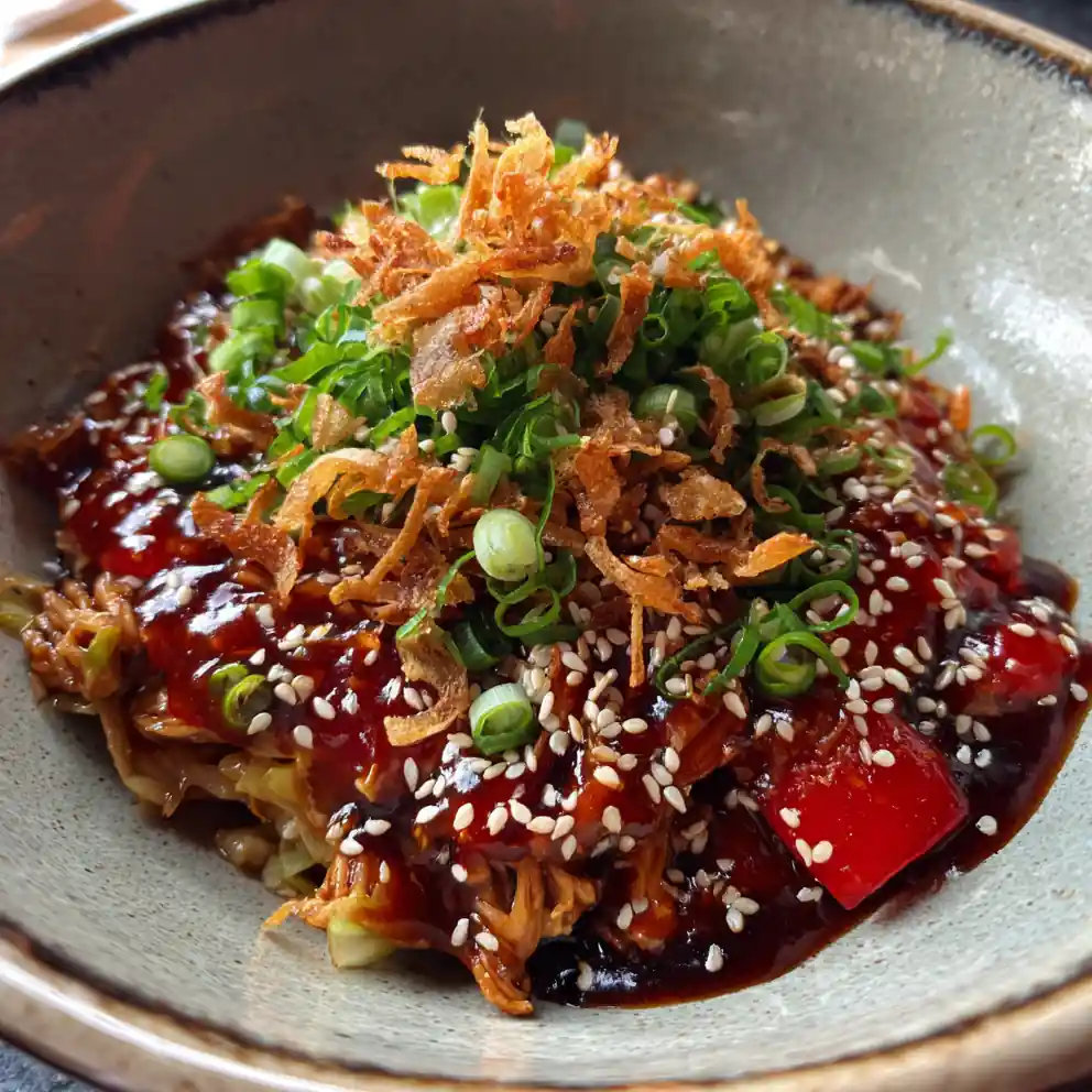 6. Garnish and Serve: Divide the mixture among bowls. Sprinkle generously with the reserved crispy shallots, sliced green onions, and toasted sesame seeds. Serve immediately.