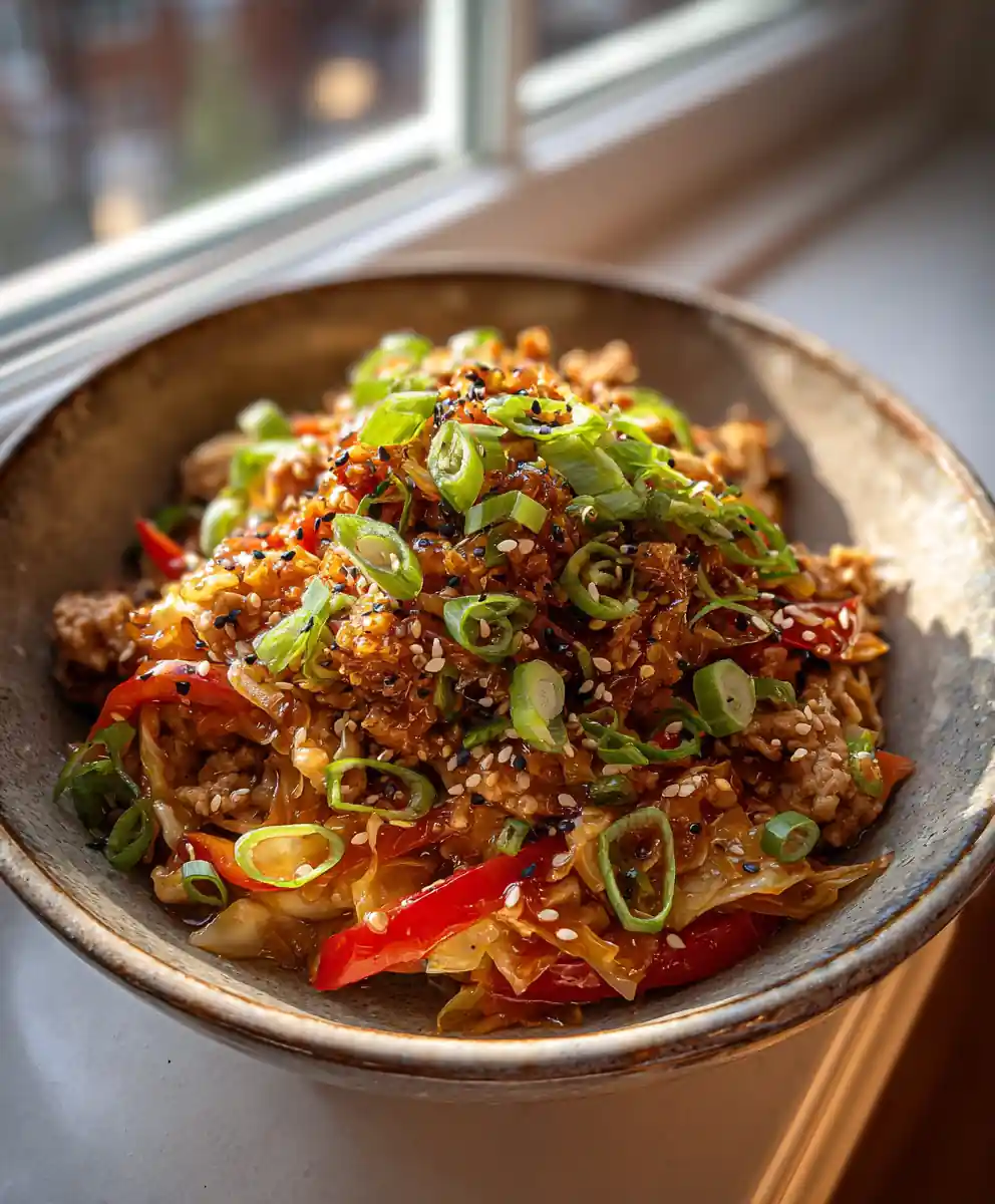 Divide the finished egg roll bowl recipe mixture evenly among deep, rustic ceramic bowls. Mound the mixture slightly in the center of each bowl and drizzle any remaining glaze from the bottom of the pan artfully over the top. Sprinkle generously with the reserved crispy shallots, sliced green onions, and toasted sesame seeds for vibrant color and textural contrast.