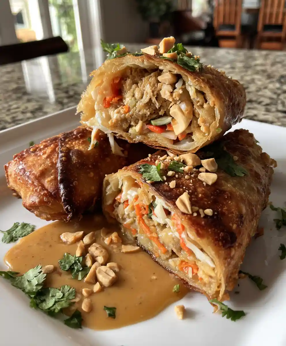 - Serve with Garnish: Arrange hot egg rolls on a platter. Serve with the cooled satay dipping sauce, garnished with chopped peanuts and cilantro.