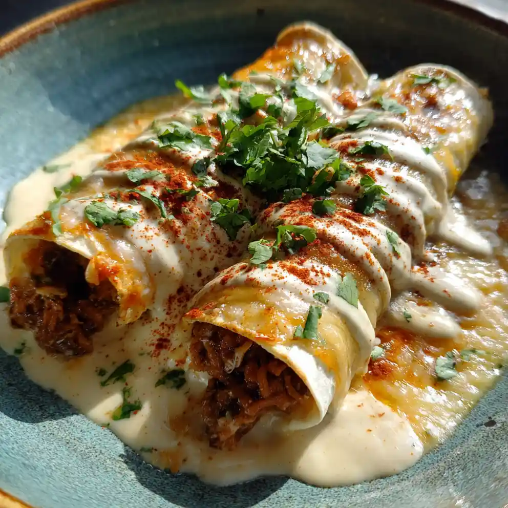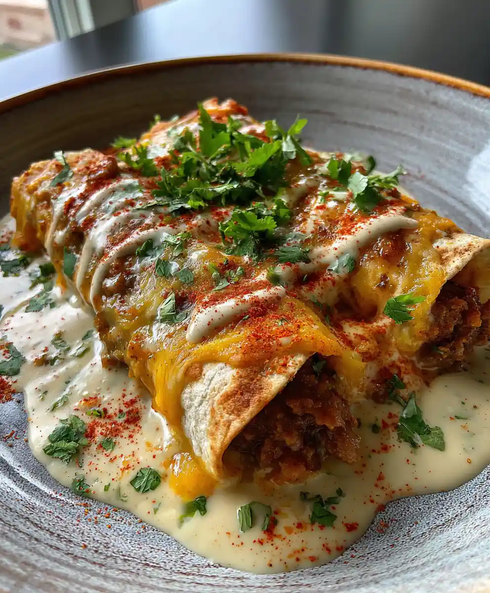 - Serve and Garnish: Remove enchiladas from the oven. Drizzle warm queso over the top, then garnish with chopped cilantro and a light dusting of smoked paprika.