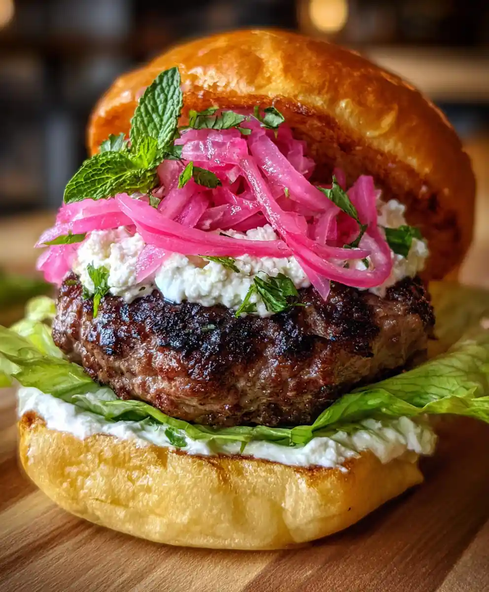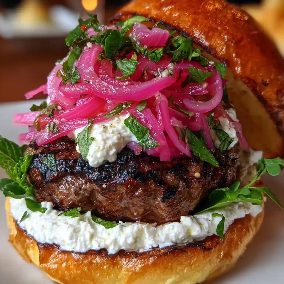 6. Assemble Your Elk Burger: On a clean plate, place the toasted bottom bun. Layer with crisp green leaf lettuce, then the hot elk patty. Generously dollop a spoonful of the creamy whipped feta spread over the patty. Mound a portion of the quick pickled red onions on top of the feta. Finish with a scatter of fresh mint and parsley leaves, then cap with the toasted top bun.