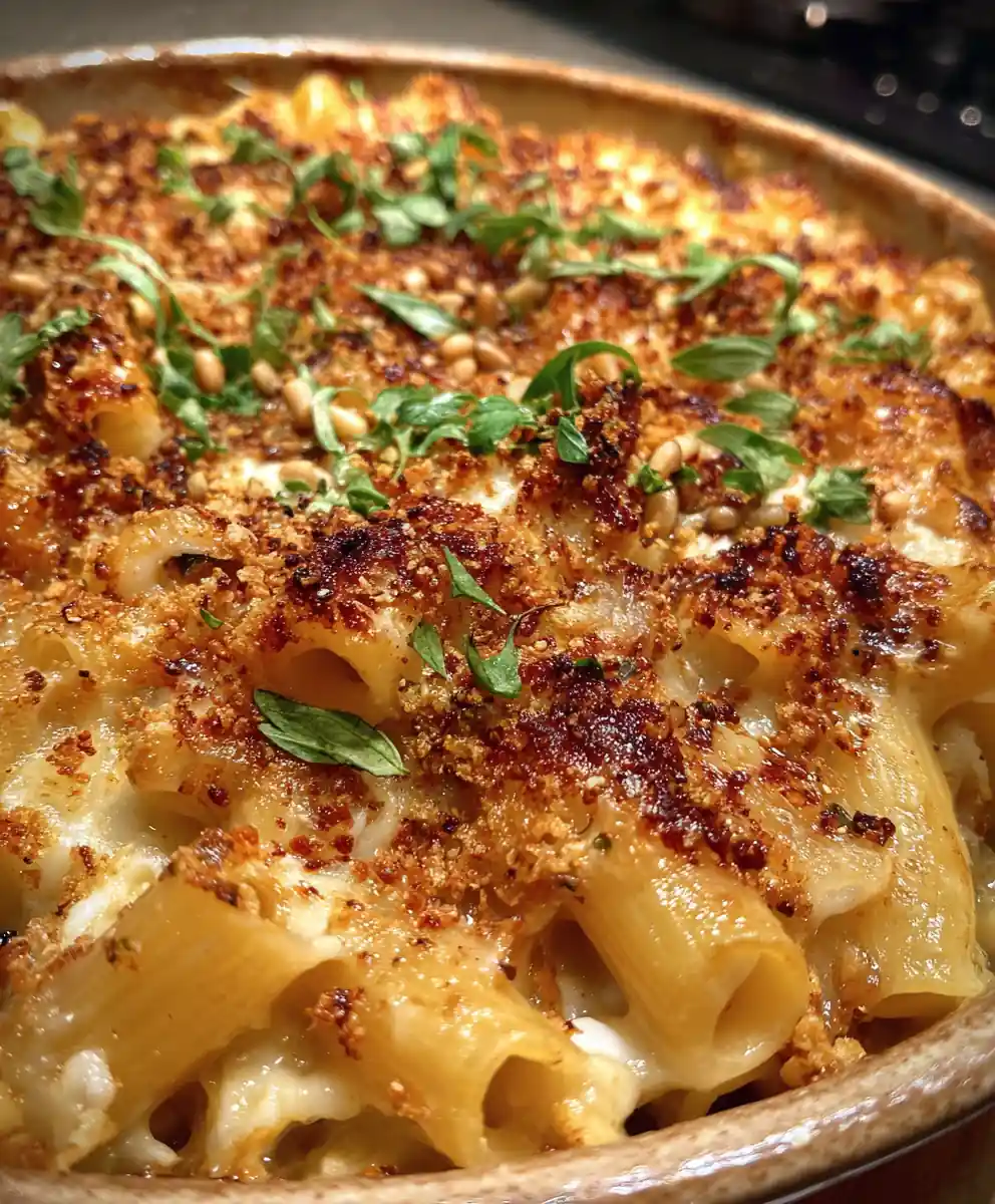 4. Bake and Garnish: Preheat your oven to 190 degrees C (375 degrees F). Transfer the creamy pasta mixture to a 2.5-liter (2.5-quart) baking dish or individual gratin dishes. Sprinkle the remaining 2 oz of Gruyรจre/Comtรฉ and 0.4 oz of Parmesan evenly over the top. Bake for 20-25 minutes, or until the cheese topping is melted, golden-brown, and bubbly. Broil for 2-3 minutes if desired for a crispier top, watching carefully to prevent burning. While baking, lightly toast 3 tbsp pine nuts in a dry pan over medium heat for 2-3 minutes, until fragrant and golden. Remove baked pasta and let rest for 5 minutes. Serve garnished with toasted pine nuts, fresh marjoram, and a light dusting of sumac.