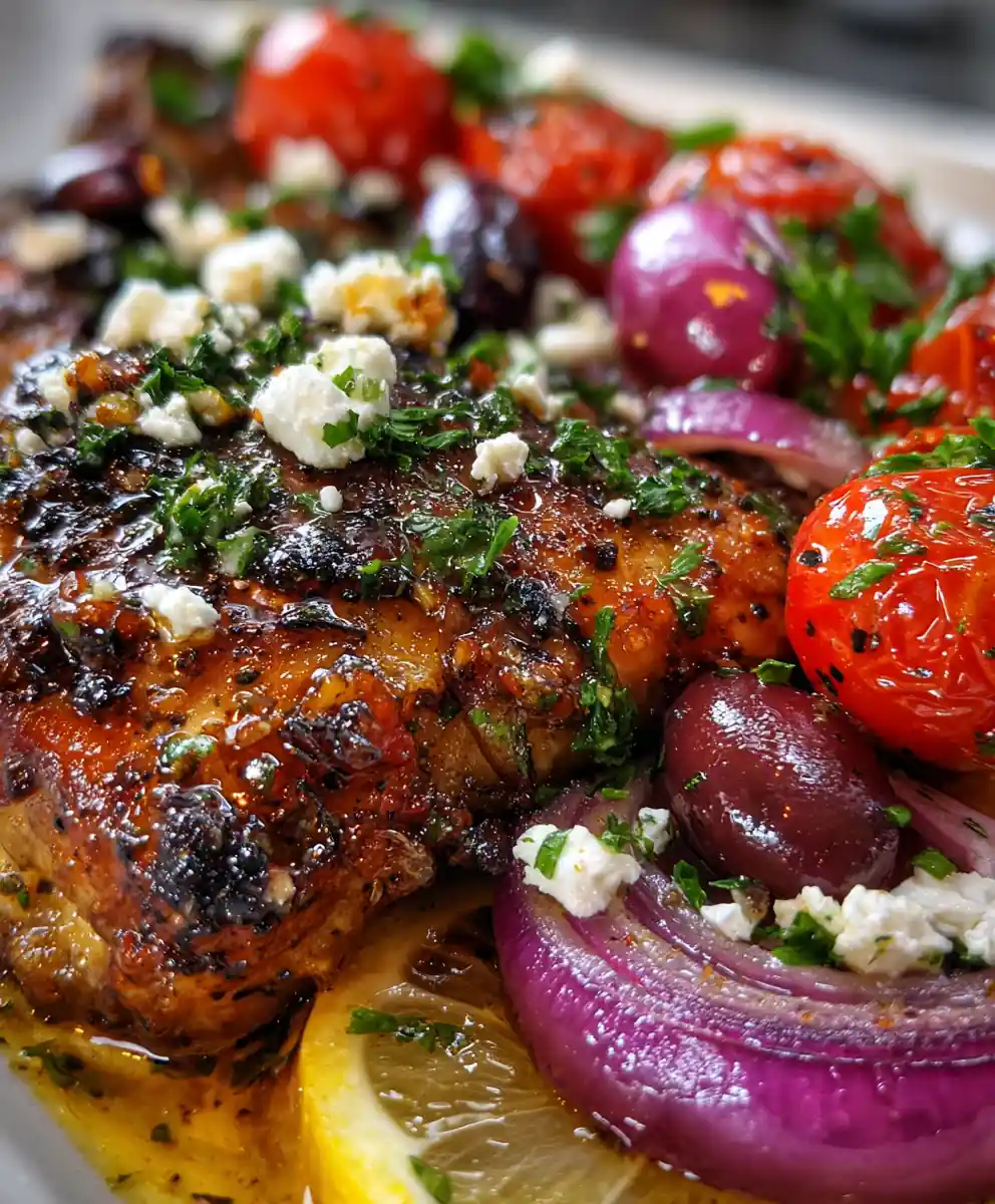 This Greek Chicken with Lemon and Feta is a flavorful dish featuring juicy chicken thighs marinated in a zesty lemon-herb blend, roasted with cherry tomatoes, olives, and topped with feta. It’s a complete Mediterranean meal.