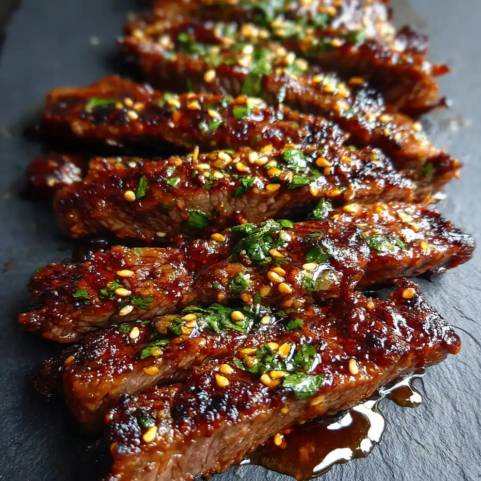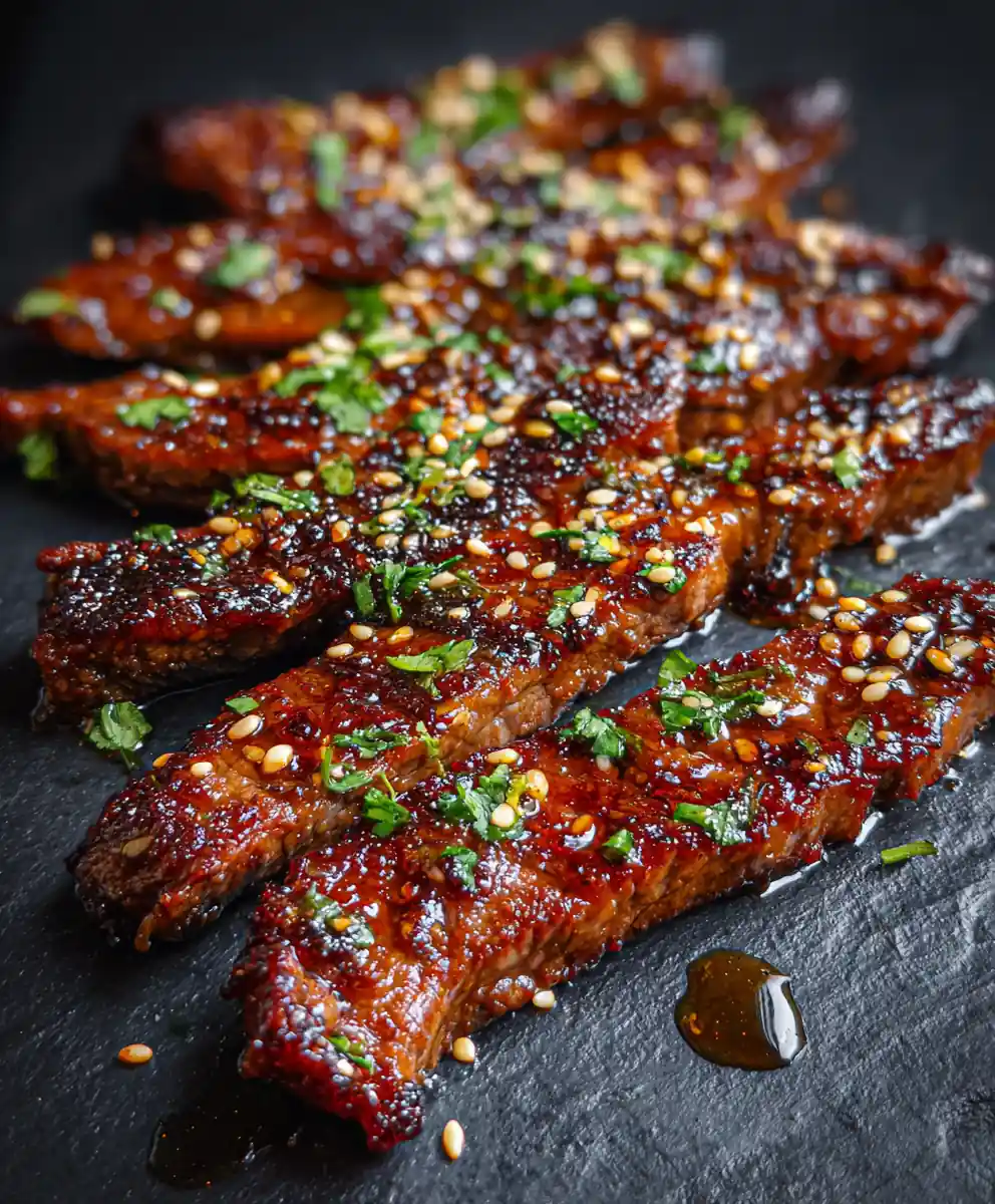 8. Plate and Garnish: Arrange the steak strips artfully on a matte black slate or dark ceramic plate. Fan them outward for visual appeal. Drizzle any remaining glaze in a thin zig-zag pattern over the steak. Scatter toasted sesame seeds and chopped fresh cilantro on top. Finish with a light drizzle of honey for a touch of sweetness and contrast.
