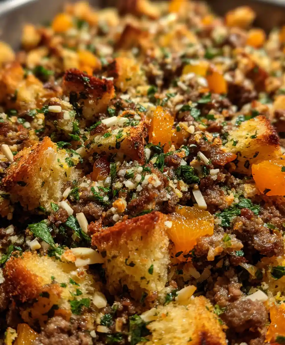 - Remove the stuffing from the oven and let it rest for 5 minutes before serving. Garnish generously with the toasted almonds, fresh parsley, and fresh mint for a vibrant finish, completing this impressive ground beef stuffing recipe.