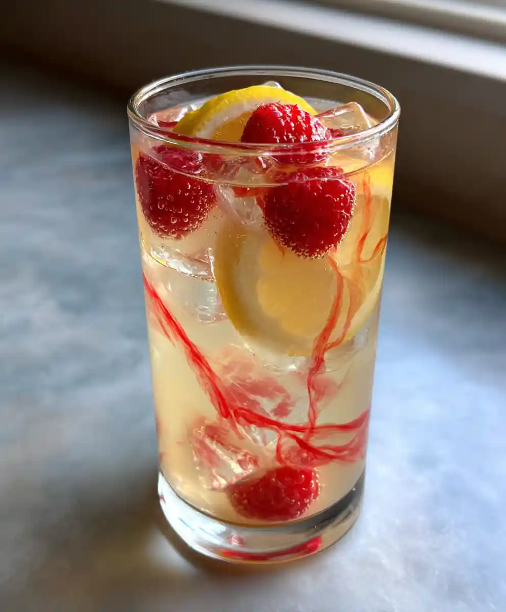 6. Chill and Serve with a Swirl: Refrigerate the assembled lemonade for at least 30 minutes, ensuring it’s ice-cold. To serve, fill clear glass tumblers generously with ice cubes. Pour the chilled lemonade into each glass, leaving about an inch of space from the rim. Then, take the chilled Raspberry-Ginger Swirl Syrup and slowly drizzle 2-3 tablespoons (30-45 ml) down the inside edge of each glass. The denser syrup will naturally create beautiful, vibrant red ribbons and pools through the pale yellow lemonade, offering a distinct visual contrast. For the final touch, garnish with a few fresh raspberries and a thin lemon slice.