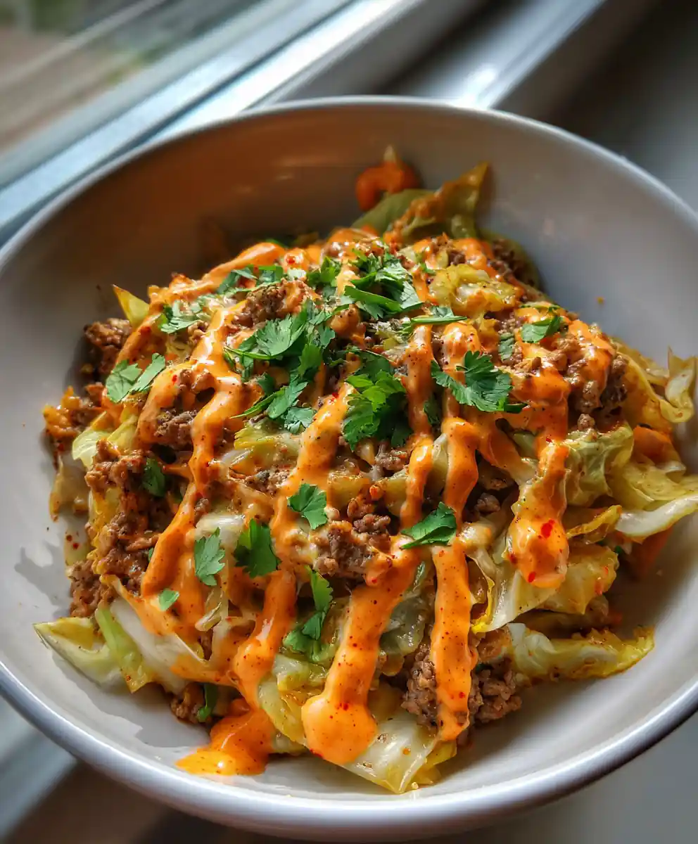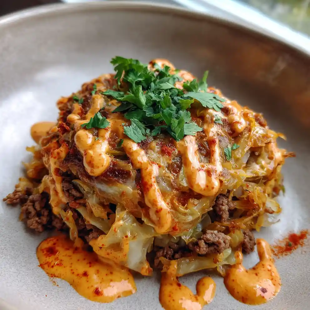 A common issue with low-carb meals is that they lack a certain depth of flavor. This keto cabbage recipe solves that by using harissa, a spice paste known for its smoky and slightly floral notes. The combination of ground beef and tender cabbage provides a hearty texture that makes this keto cabbage recipe feel complete. The addition of the creamy swirl transforms this simple skillet into something truly satisfying, far removed from typical diet food.
