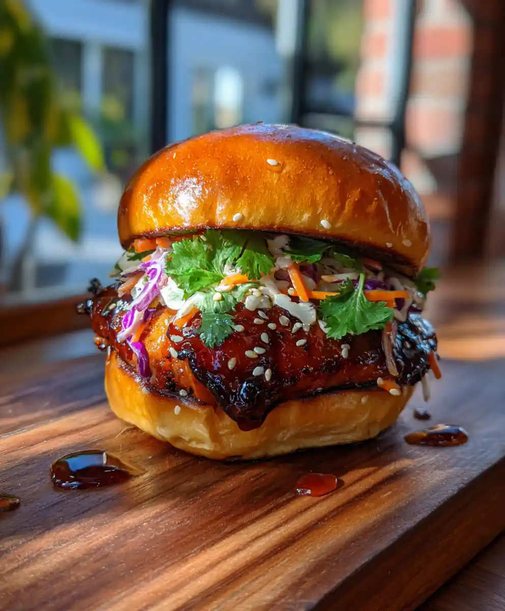 6. Assemble the Sandwich: Spread a thin layer of gochujang mayo (mayonnaise mixed with 1 teaspoon of gochujang) on the bottom half of each brioche bun. Place a grilled chicken thigh on top of the gochujang mayo. Drizzle a little extra caramelized gochujang glaze over the chicken. Add a generous heap of the crispy slaw on top of the glazed chicken. Finish with a few fresh cilantro leaves and a sprinkle of toasted sesame seeds. Top with the bun lid.
