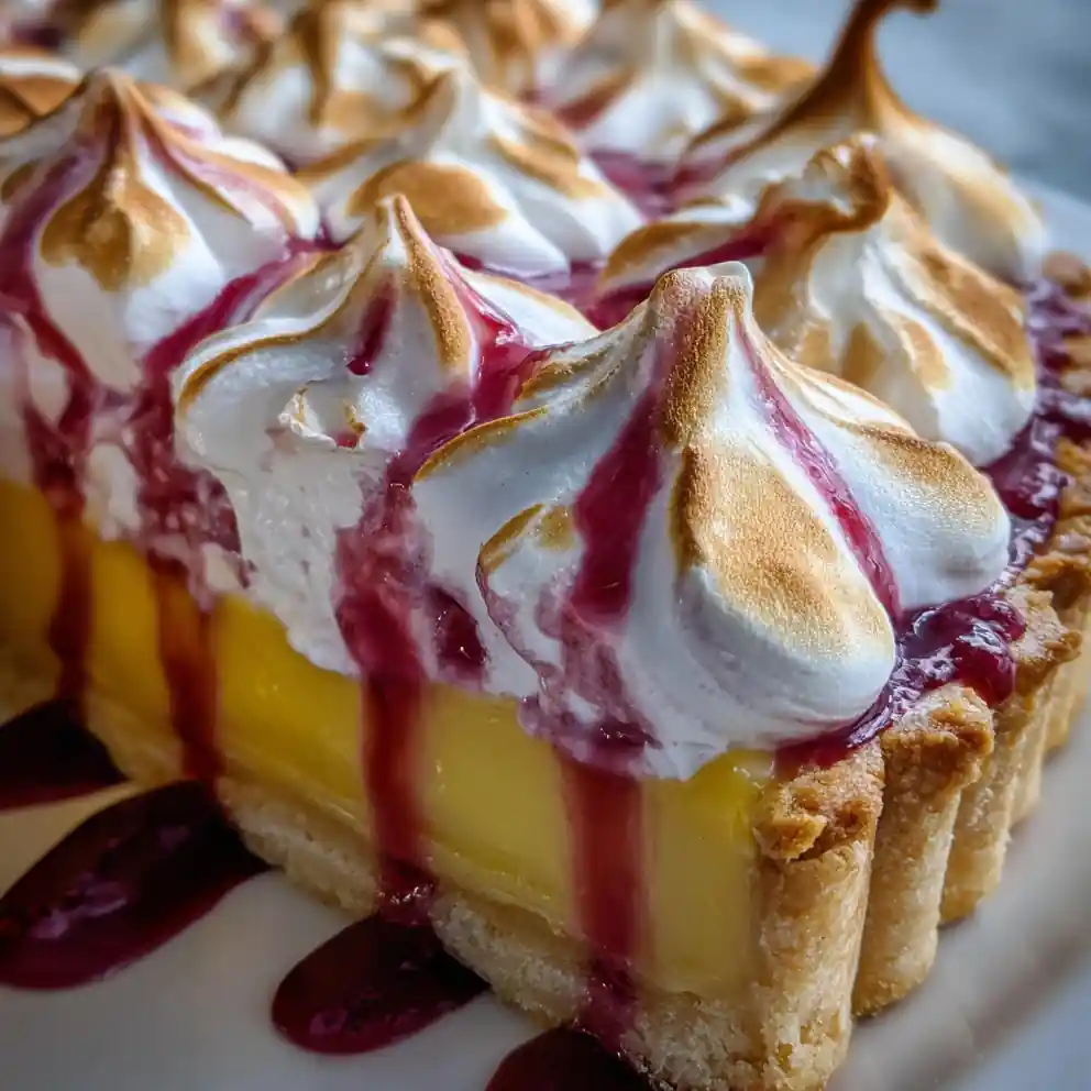 This lemon meringue pie features a tangy lemon filling, fluffy toasted meringue, and a vibrant raspberry stripe topping, offering a modern twist on a classic dessert. It guides you to a perfect, impressive, and surprisingly simple dish.