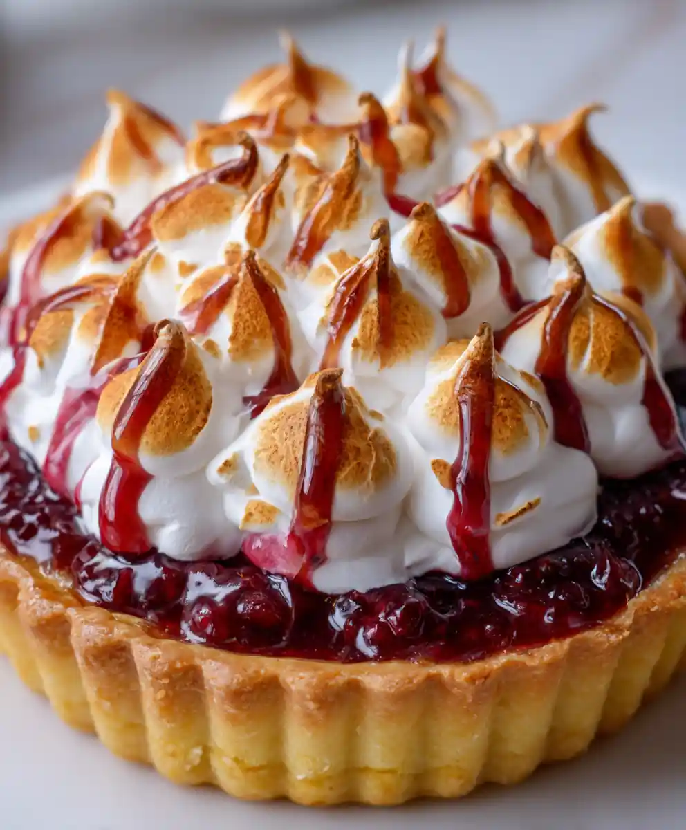 5. Assemble and Bake Pie: Spread meringue over the hot lemon filling, ensuring it seals completely to the crust edges. Drizzle the prepared raspberry sauce in stripes over the meringue. Bake until the meringue is golden brown (12-15 minutes at 350F/175C).