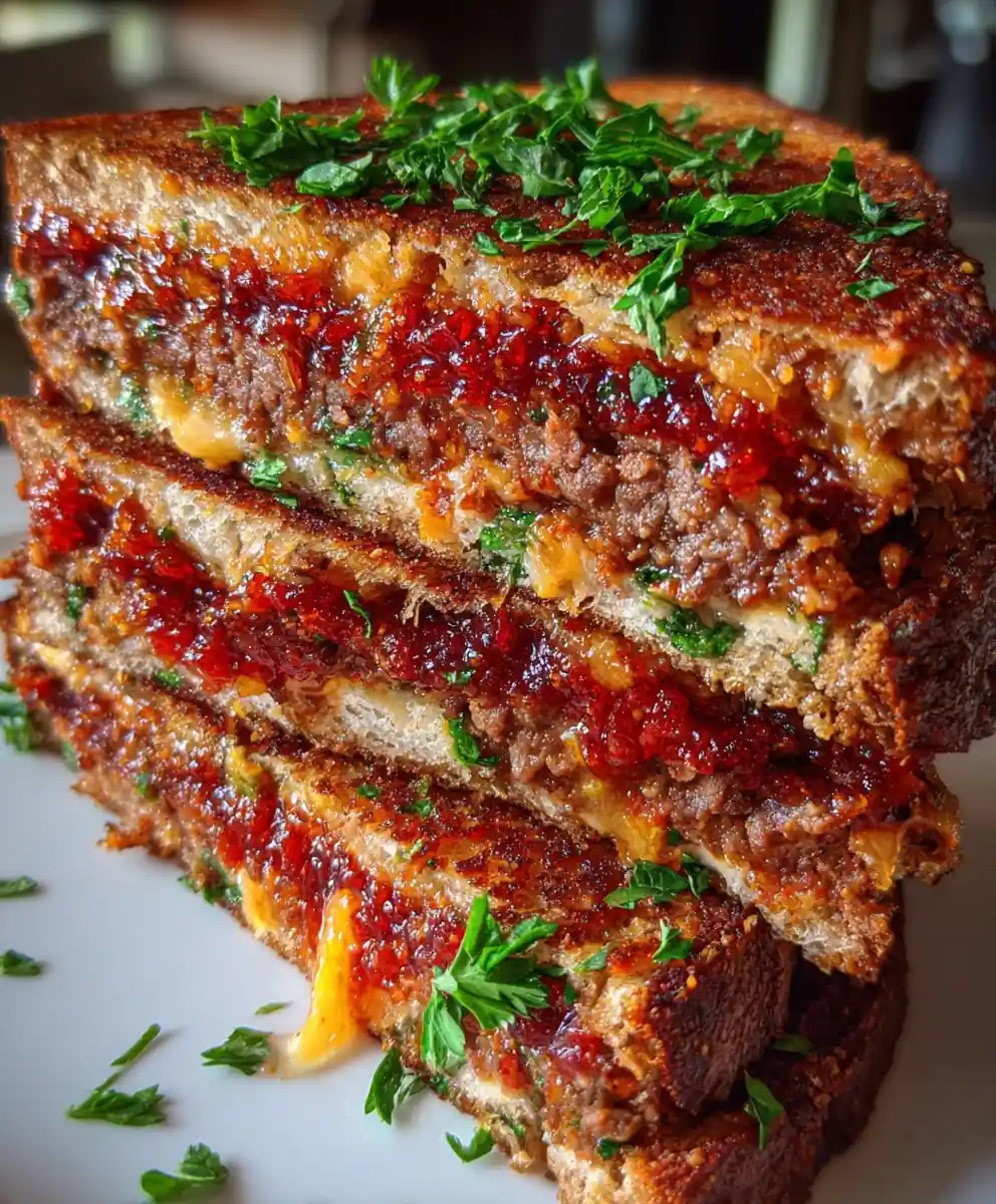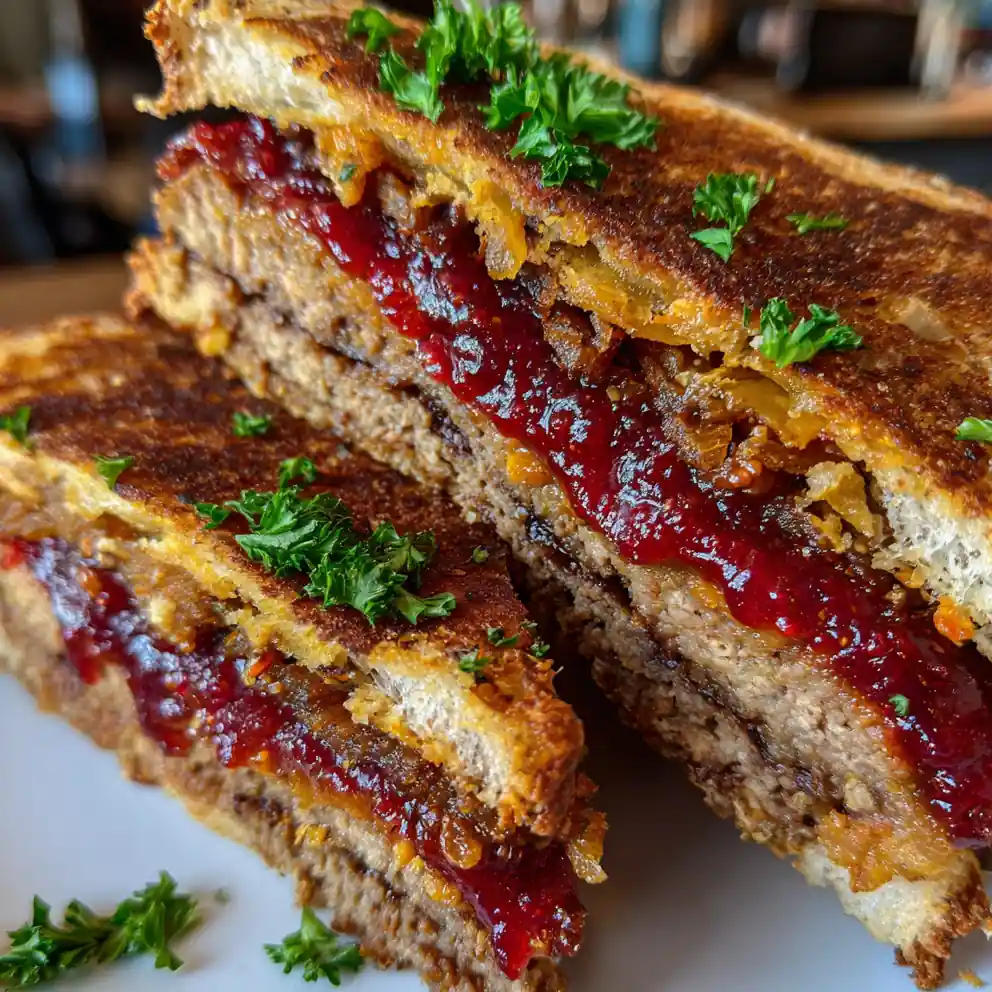 - Assemble the Meatloaf Sandwich: Spread a generous layer of the Smoky Harissa-Tomato Jam on one side of each toasted bread slice. Layer two slices of meatloaf onto half of the bread. Top with a spoonful of the Crispy Za’atar Onions and a sprinkle of fresh parsley. Place the remaining jam-side down bread on top to form your sandwiches. Serve immediately while warm.