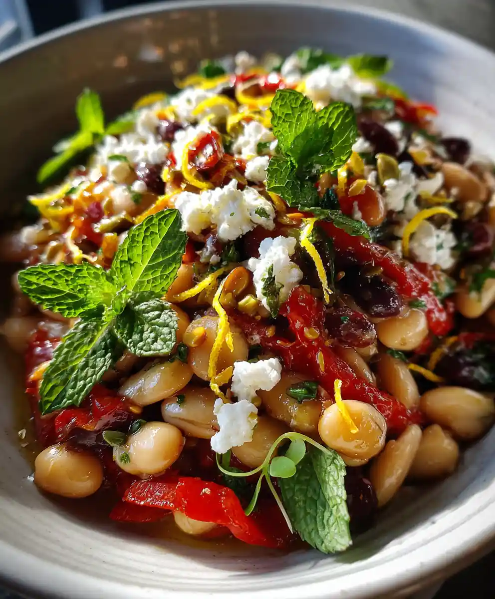 8. Assemble and Garnish: Just before serving, crumble the halal-certified feta cheese over the marinated bean salad. Sprinkle the toasted pine nuts evenly over the top. Dust lightly with sumac (if using), add curls of lemon zest, and finish with a handful of delicate microgreens for a pop of color and freshness.