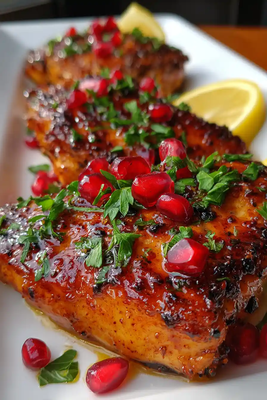 - Plate & Garnish: Plate with pomegranate arils, parsley, and lemon wedges.