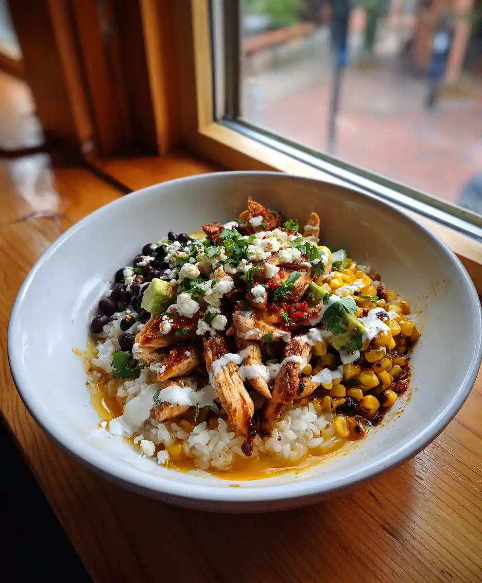 Craving a vibrant and satisfying meal thatโ€™s bursting with authentic Mexican flavors? Look no further than our Mexican Street Corn Chicken Bowl with Cilantro Lime Crema! This isnโ€™t just another bowl; itโ€™s a culinary journey inspired by the beloved elote (Mexican street corn) but reimagined for a complete and balanced meal. Tender, spice-rubbed chicken, sweet charred corn, smoky poblano peppers, and creamy black beans all come together in perfect harmony, topped with a zesty cilantro-lime crema that will have you coming back for more. Itโ€™s quick to prepare, customizable to your spice preference, and guaranteed to brighten up your dinner table. Get ready to experience a fiesta in every bite!