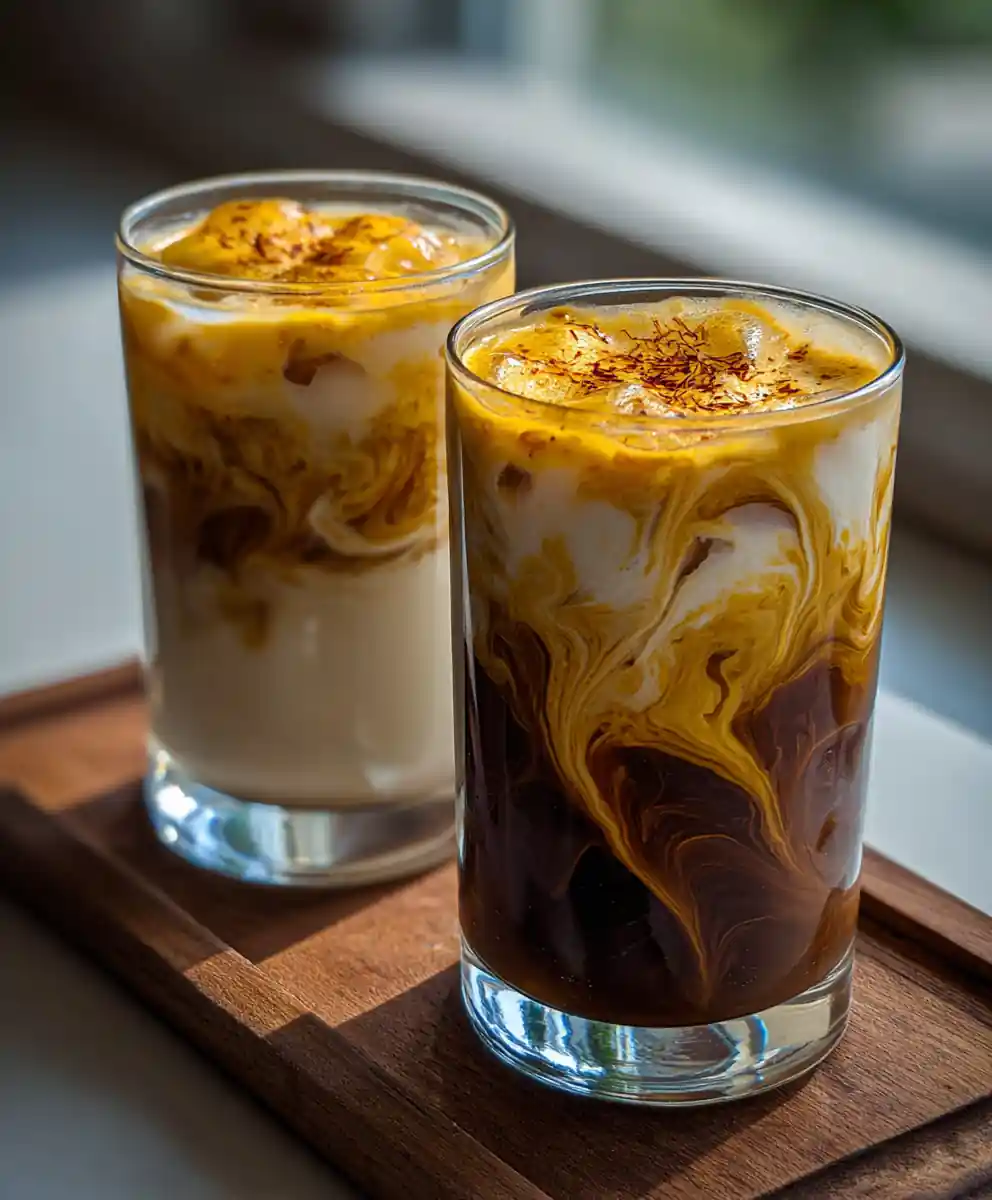 - Assemble Drink: Divide the warm cardamom milk tea between two serving glasses. Slowly pour half of the saffron-infused cream into each glass to create a golden swirl on top.