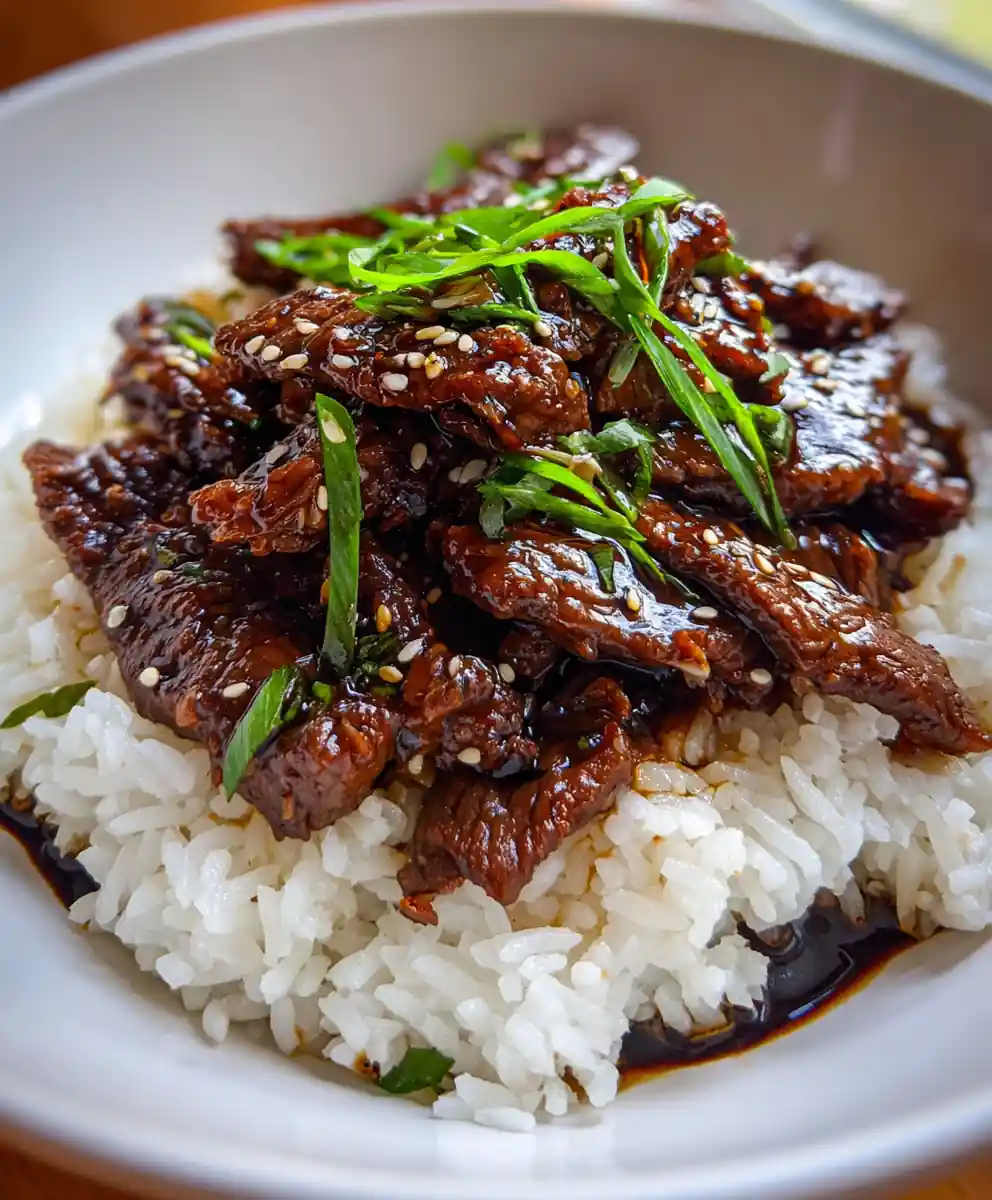 5. Combine & Serve (2 minutes): Return the seared beef to the wok. Toss gently to coat the beef completely in the thick, glistening black garlic glaze. Serve this mongolian beef recipe immediately over hot white rice, garnished generously with thinly sliced fresh scallions and a sprinkle of toasted sesame seeds for vibrant color and crunch.