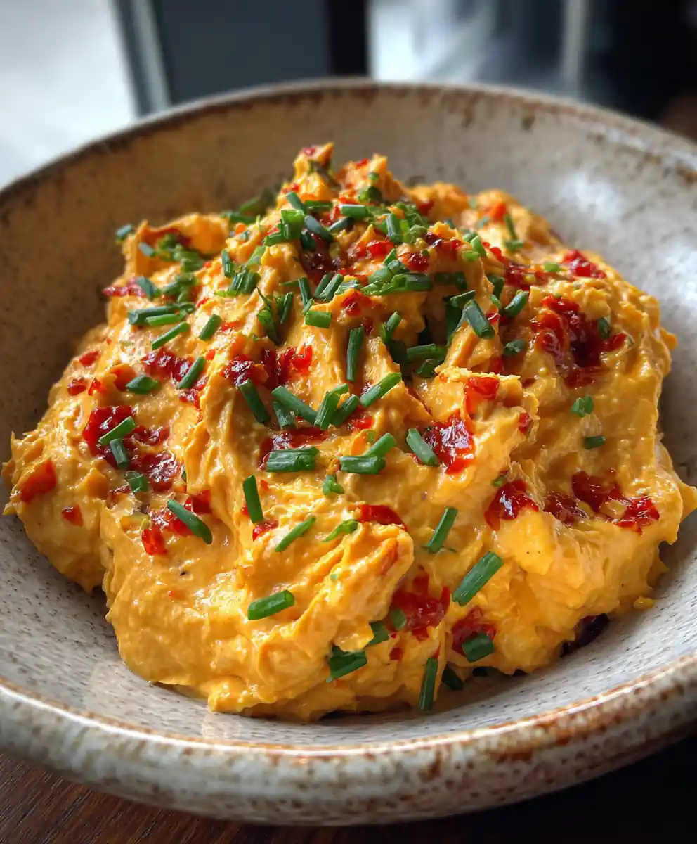 5. Garnish and serve: To serve, spoon the swirled pimento cheese into a rustic ceramic bowl. Using the reserved 1 tablespoon of chili purรฉe, drizzle a small, artistic swirl or a few drops over the top of the pimento cheese. Finish by sprinkling the finely chopped fresh chives evenly over the top for a fresh green contrast against the vibrant red and yellow tones. Serve with sturdy crackers, toasted baguette slices, or fresh vegetable sticks for healthy eating.