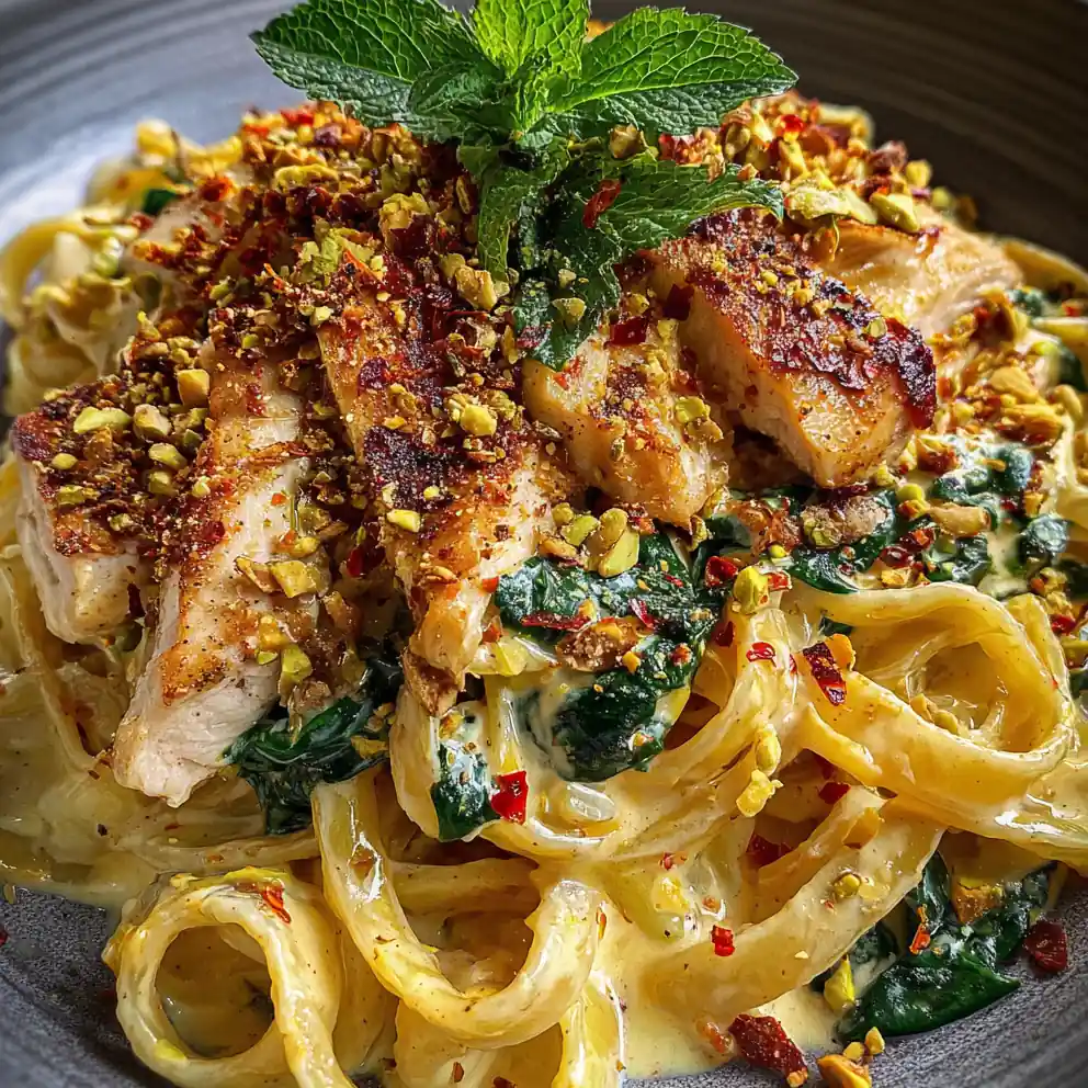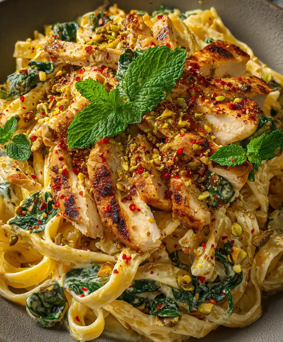 - Serve Artfully (1-2 minutes): Divide the pasta into deep, neutral-toned pasta bowls (e.g., matte white or dark gray) to highlight the dish’s warm colors. Arrange the pasta in a gentle swirl, ensuring some sliced chicken and vibrant green spinach are visible on top. Artfully drizzle the infused chili oil in a zig-zag pattern across the pasta. Scatter the toasted pistachios evenly over the top, then nestle torn fresh mint leaves among the pasta for a final burst of color and aroma. Finish with a light grating of the remaining 30 g (0.25 cup) Parmesan-style cheese over each serving.