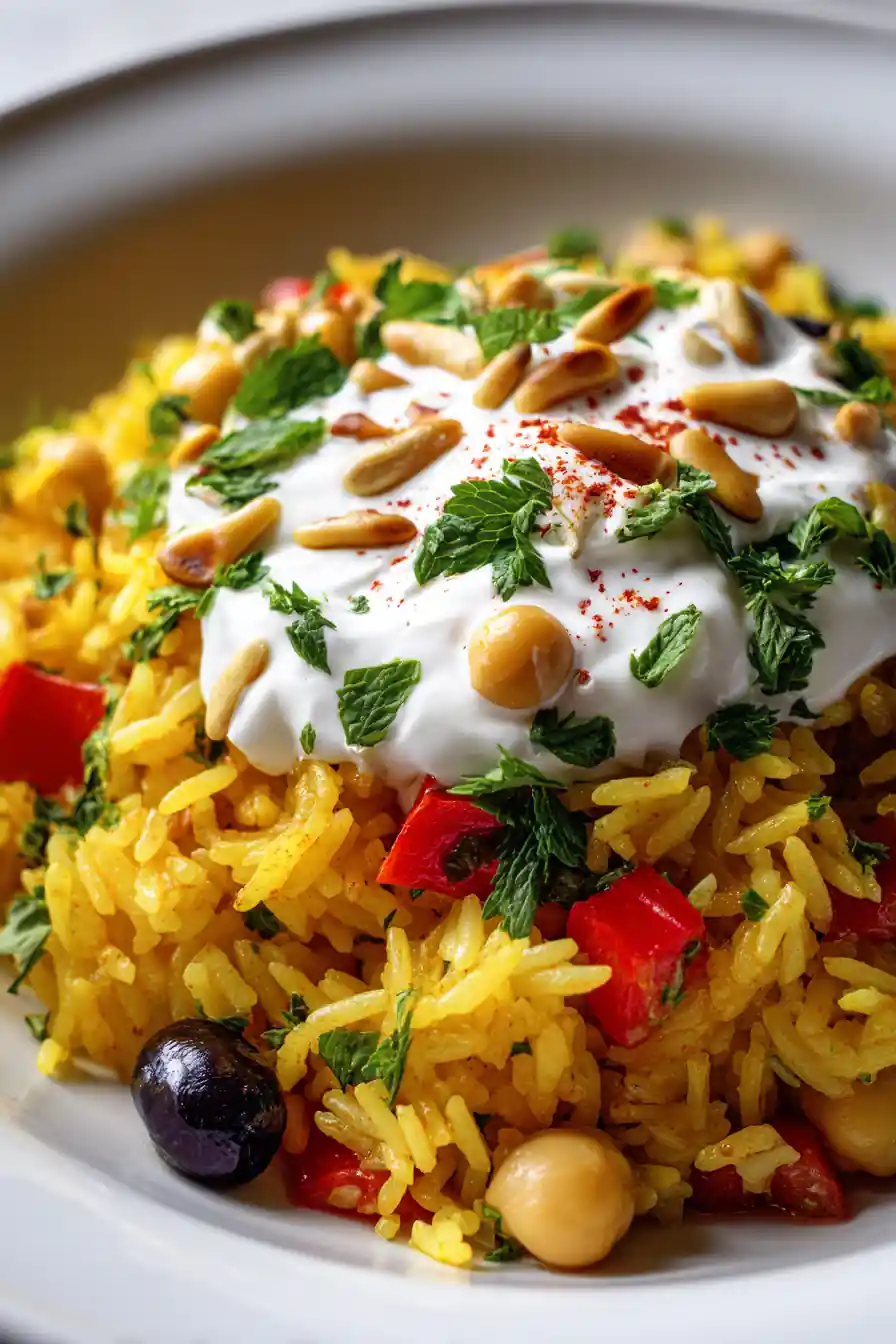 - Serve and Garnish: Plate the One-Pot Fluffy Mediterranean Rice on a shallow dish. Drizzle with plain yogurt, sprinkle with toasted pine nuts, and garnish with extra lemon zest or sumac for a beautiful presentation.