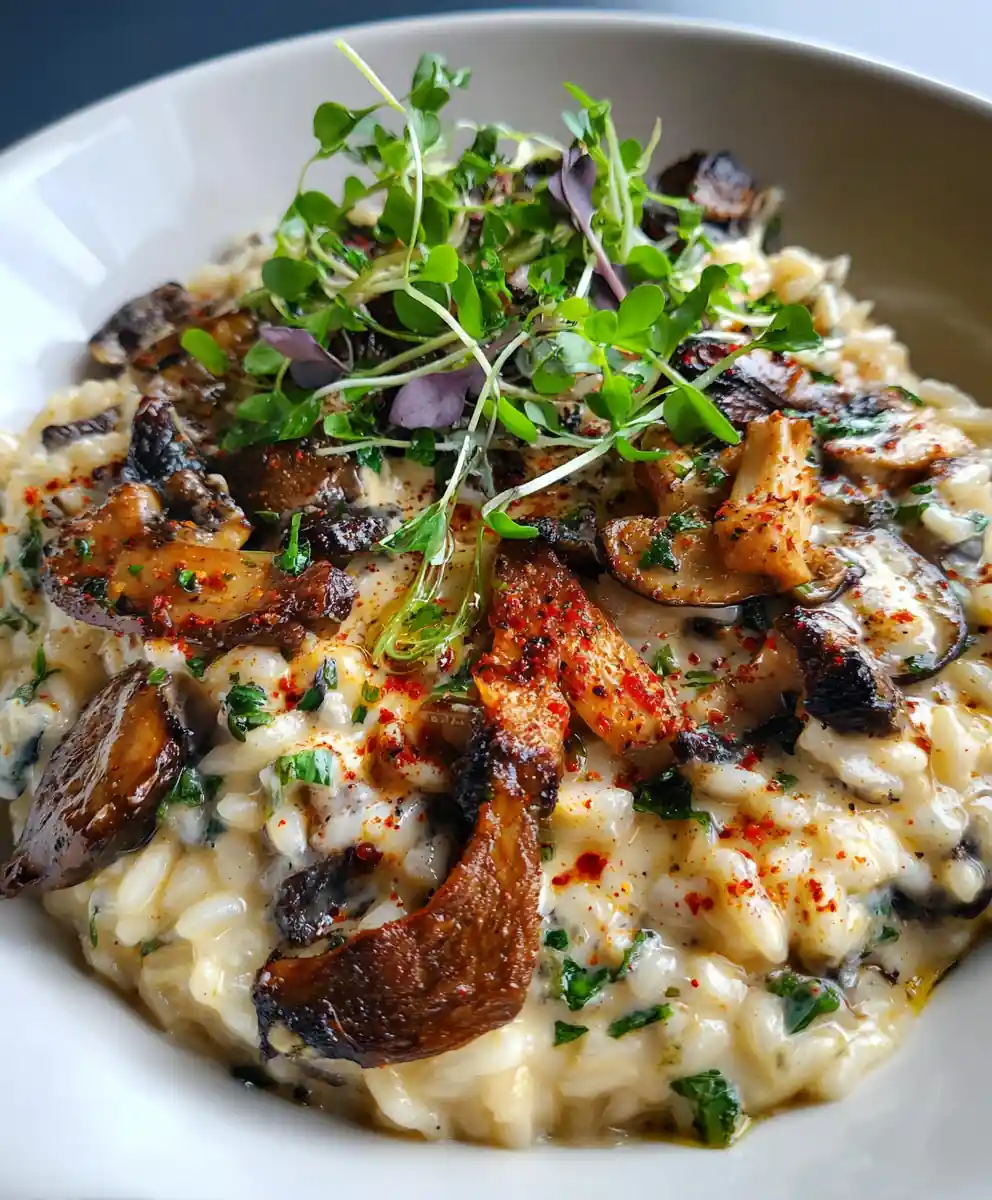 - Plate and Garnish: Spoon the creamy mushroom rice into wide, shallow bowls. Drizzle with a thin line of truffle oil (if using), scatter with chopped fresh parsley and microgreens, and finish with a light dusting of smoked paprika for a touch of color and smokiness.