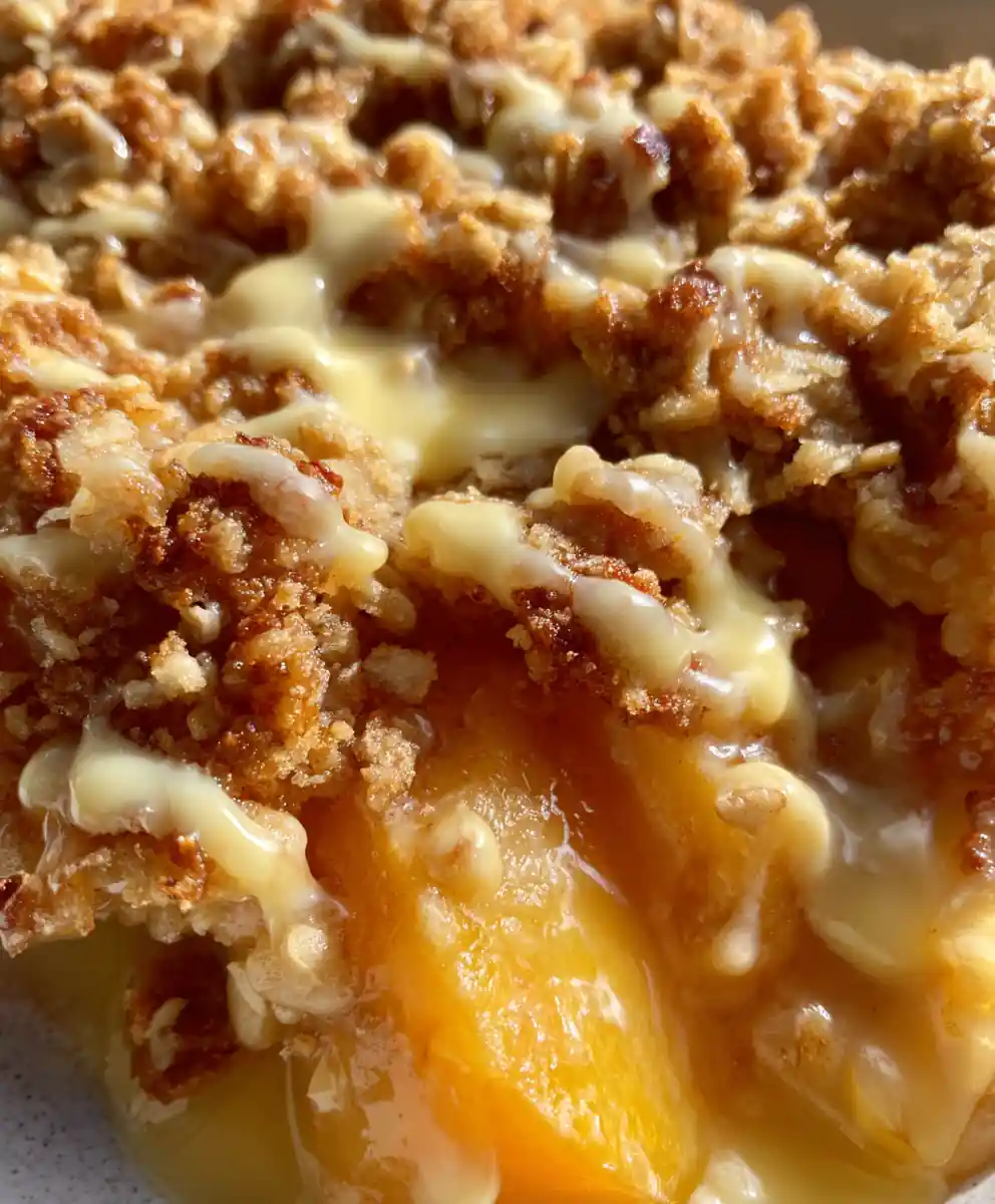 To make this peach crumble recipe even lighter, opt for whole wheat flour or almond flour in the crumble topping. Reduce added sugars by up to ¼ cup (50g) or use a natural sweetener like maple syrup for the filling. Choose a lighter cream or plant-based milk for the drizzle, and consider increasing the fruit content to boost nutrition.